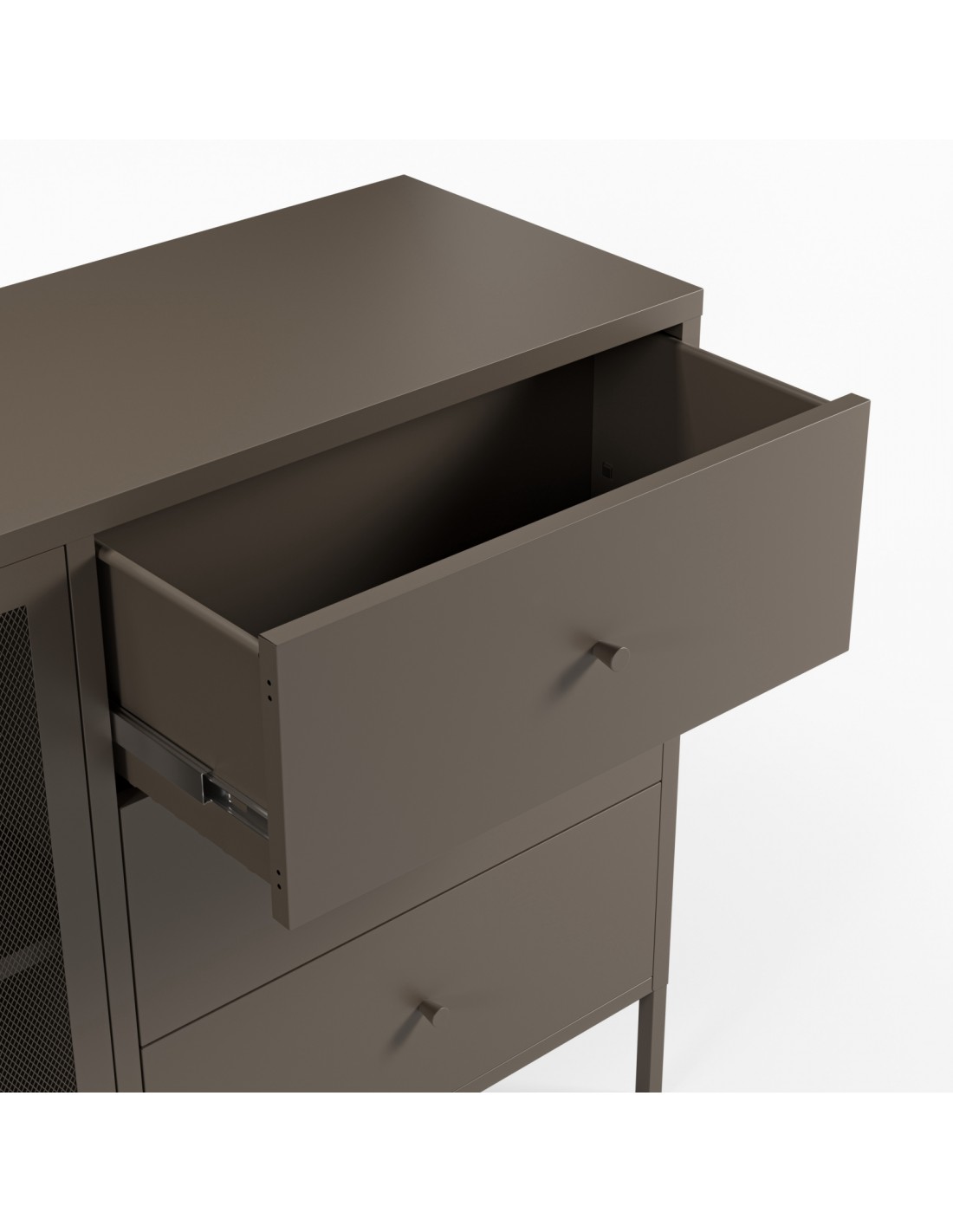 El aparador FAYNA combina minimalismo contemporáneo con la solidez de una estructura 100% metálica. Sus 140 cm de ancho lo hacen perfecto para salones, comedores o entradas que buscan orden y personalidad. Su diseño, con puertas de rejilla perforada y tres cajones espaciosos, lo convierte en una solución funcional sin renunciar al estilo.
