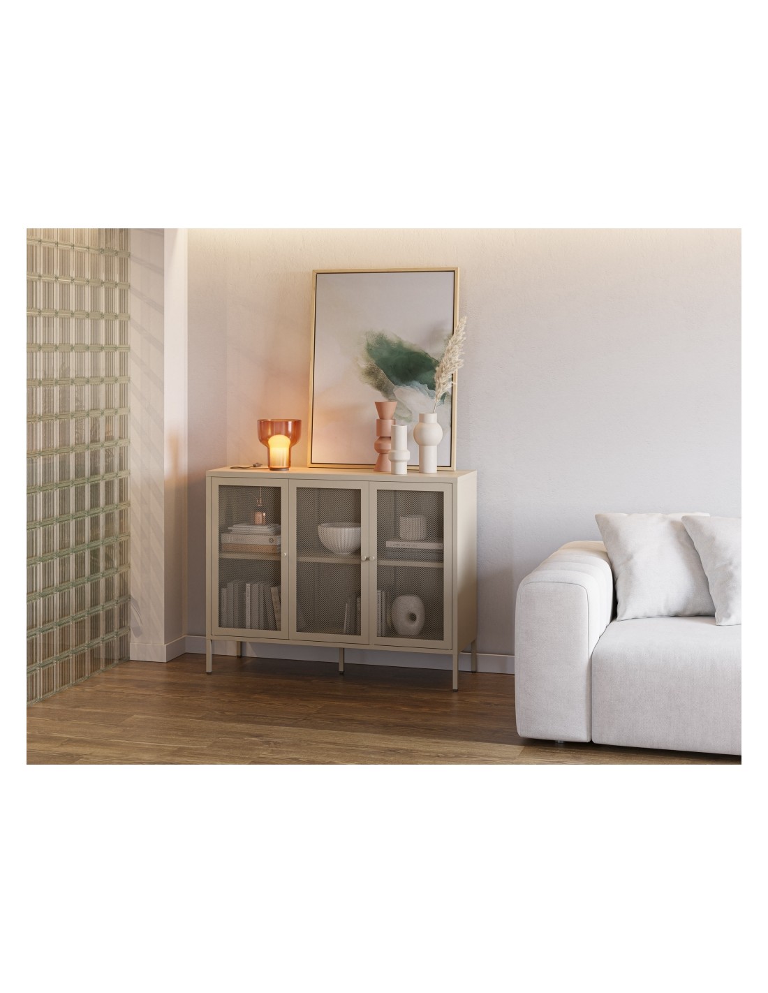 Aparador metálico minimalista FAYNA crema 120 cm y 3 puertas