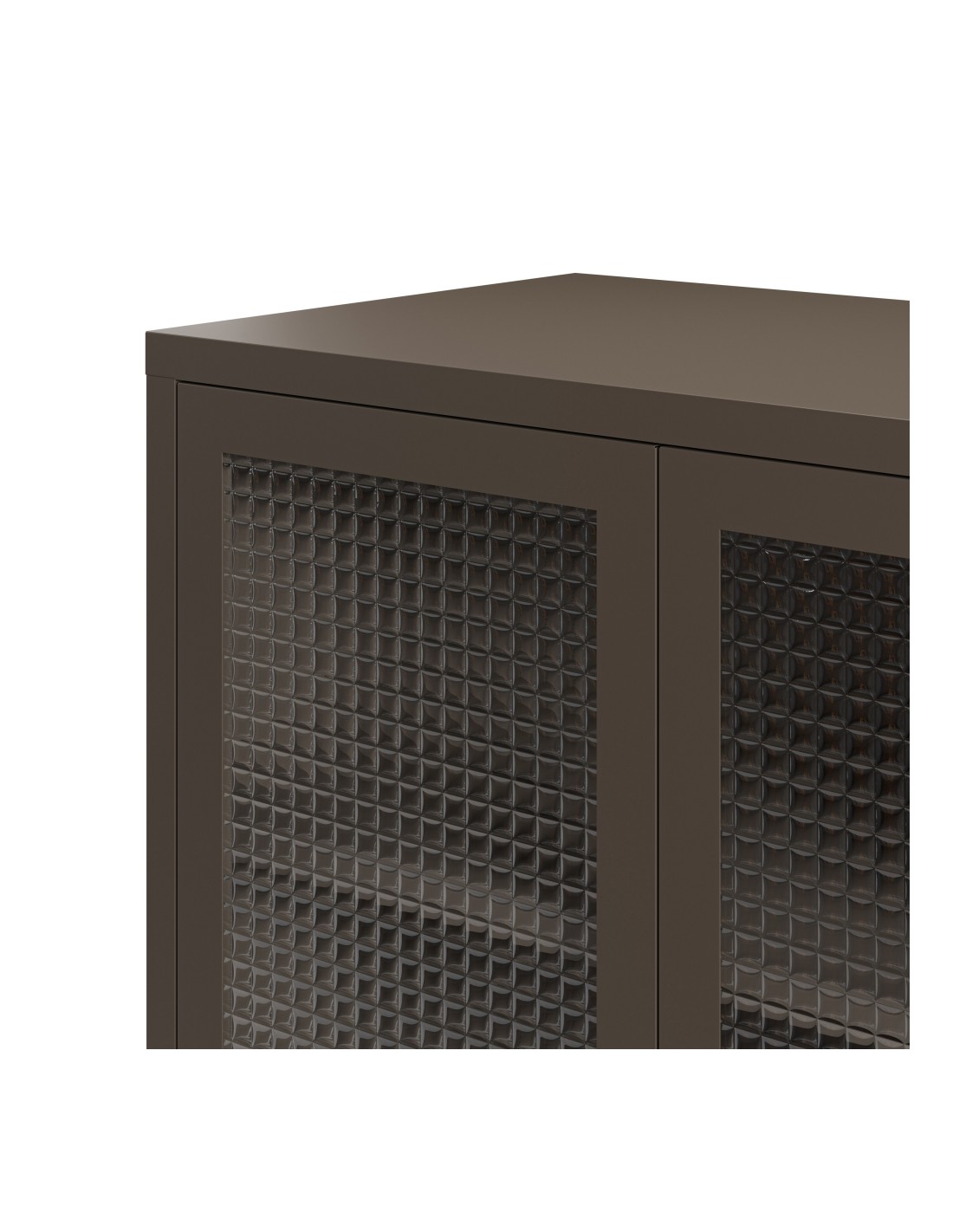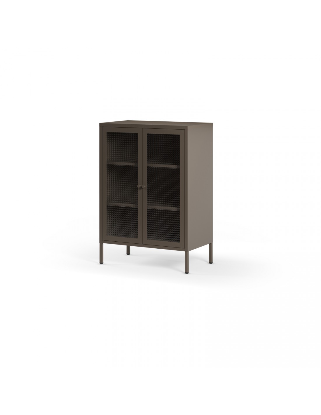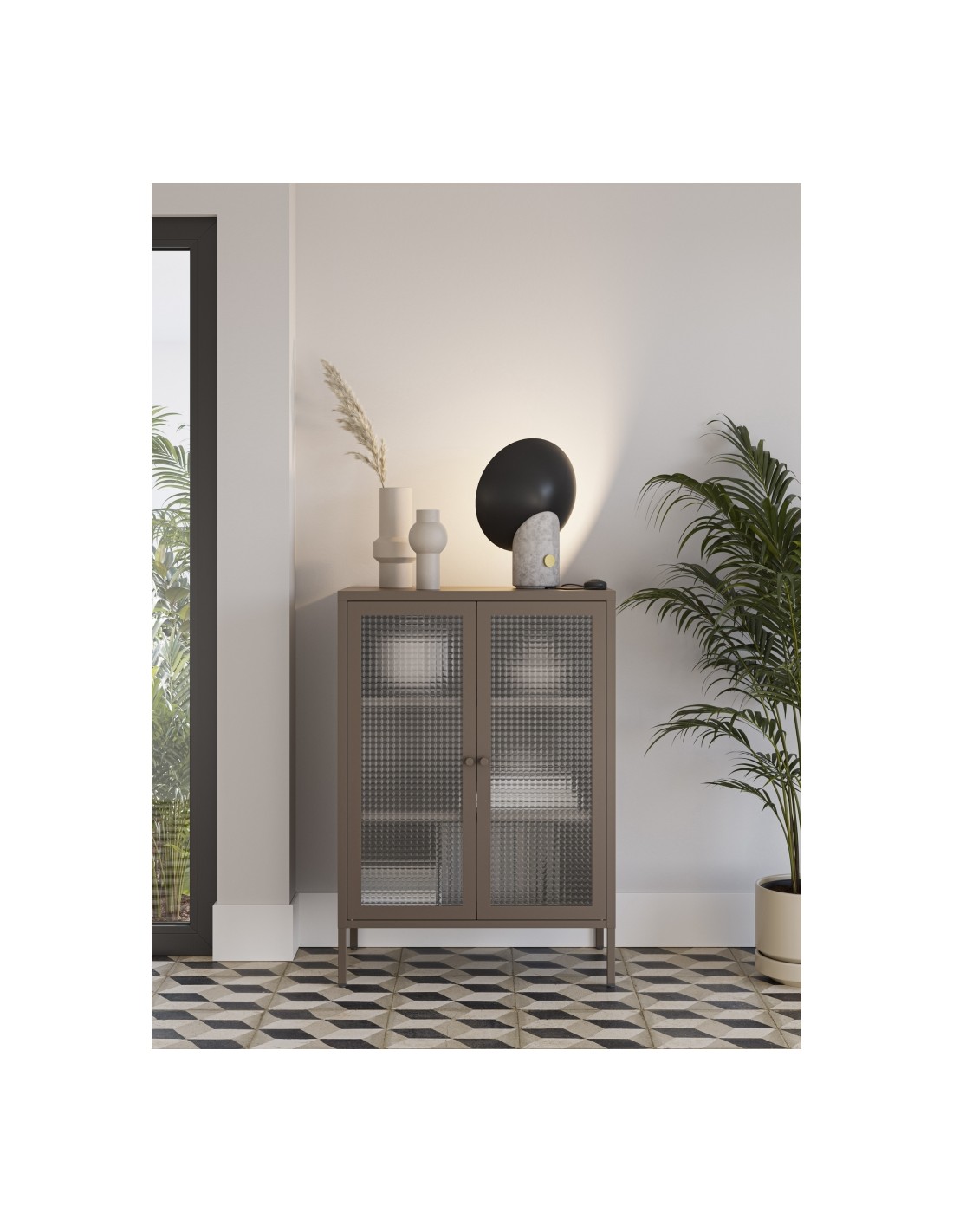 Imagina este mueble LAYNA colocándose justo al lado de una pared clara, con una planta de altura media a su lado y una lámpara de diseño sobre él. En color moca combina perfectamente con detalles en cobre, terracota o tonos neutros. En un recibidor, puede servir como mueble consola, con las puertas de cristal dando visibilidad a objetos de bienvenida. En un comedor, puede alojar vajilla o mantelería mientras queda accesible y estilizada.