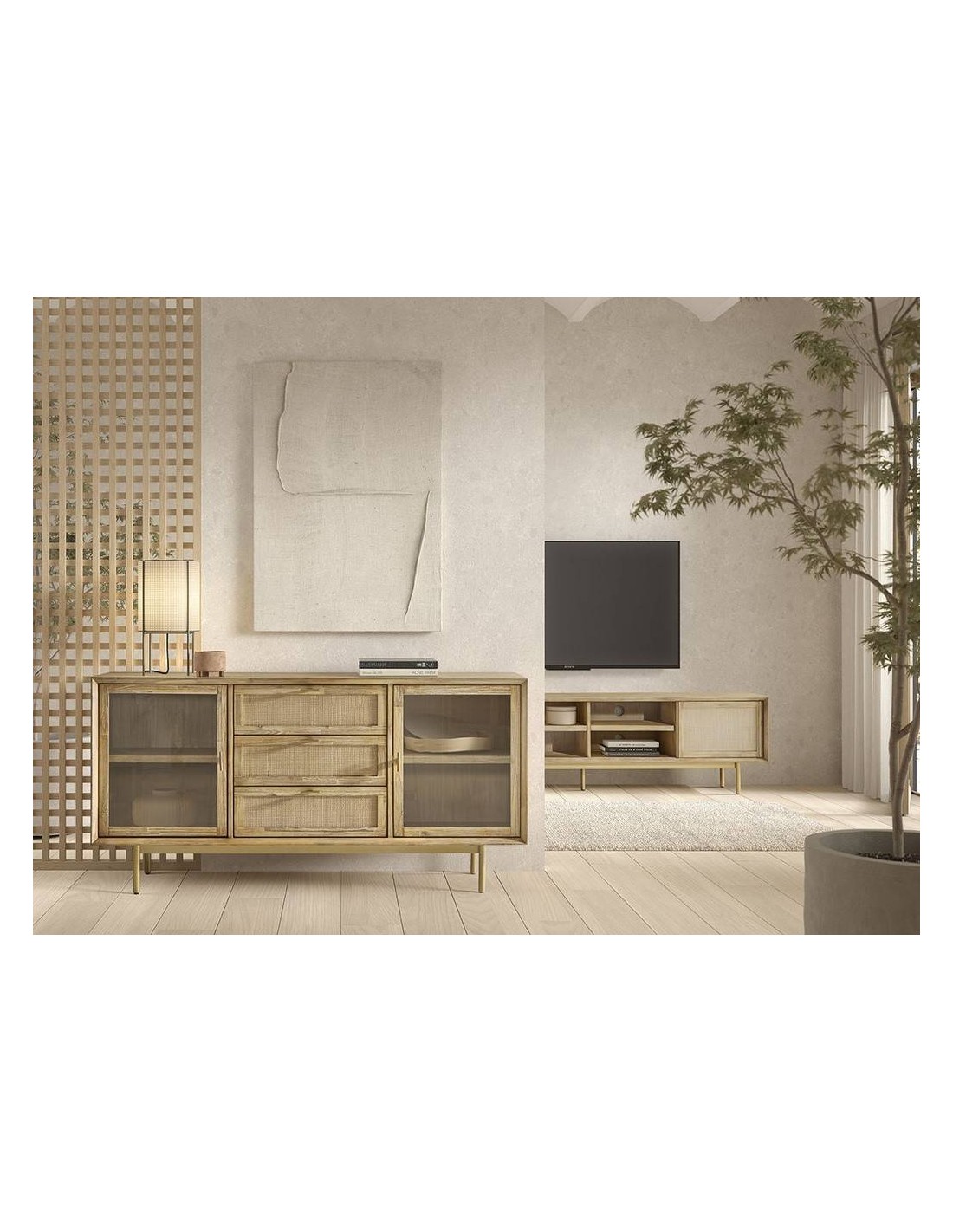Este aparador no solo es una declaración de estilo, sino que también es extremadamente funcional. Con un amplio espacio de almacenamiento, es ideal para guardar vajillas, cubiertos, libros o cualquier objeto que desees exhibir. El equilibrio entre lo natural y lo moderno hace que el aparador ANDES sea una elección excepcional para aquellos que buscan una pieza versátil que se adapte a una variedad de estilos decorativos, añadiendo un toque de lujo y calidez a su hogar.
