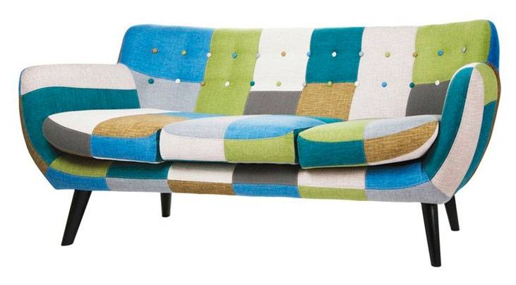 Contrastando con el estilo retro anterior, encontramos los sofás de vivos colores y materiales de fácil cuidado como el vinilo, charol o el cuero. A veces, para redondear el atrevimiento, muestran diseños llamativos imitando coches de época, carnosos labios rojos, coronas de flores, etc. Suelen instalarse en estancias con láminas y alfombras de colores y diseños igualmente atrevidos.