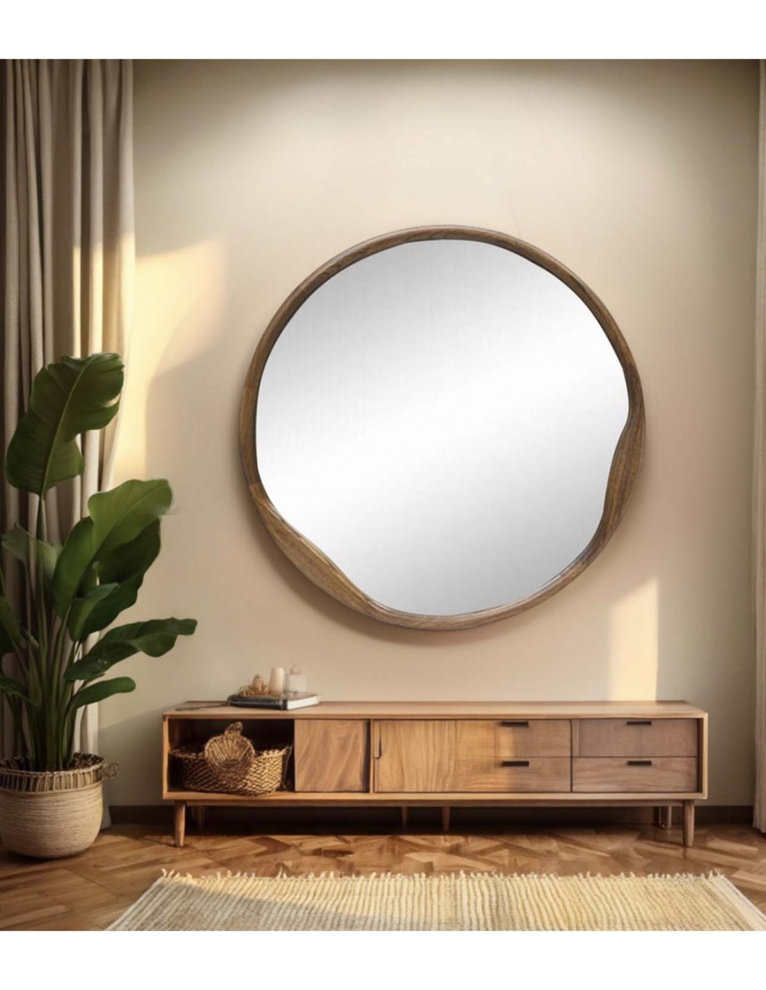 - Funcionalidad: El espejo redondo aporta suavidad visual y mejora el equilibrio del espacio.