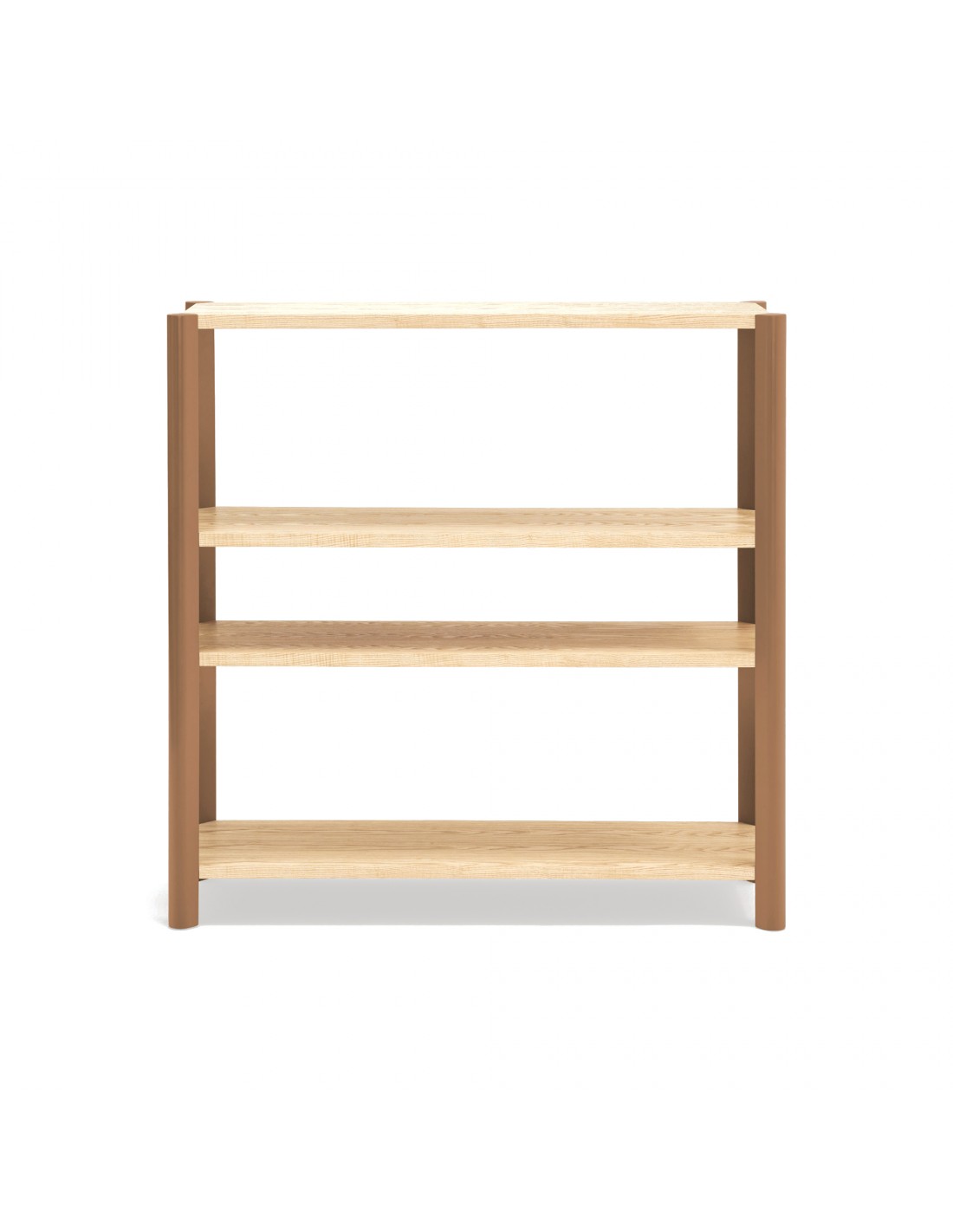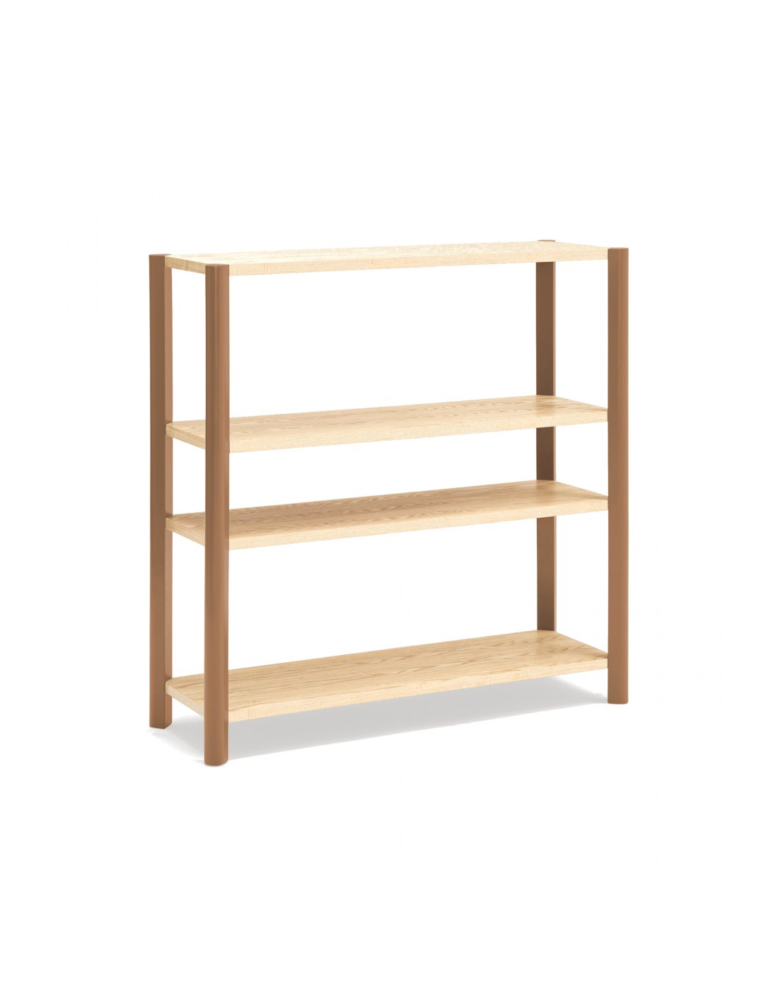 - Acabados combinados: estantes en madera natural y patas lacadas en tono arcilla.