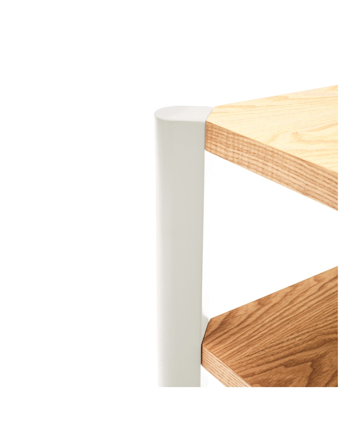 - Acabados combinados: estantes en madera natural y patas lacadas en tono crema.