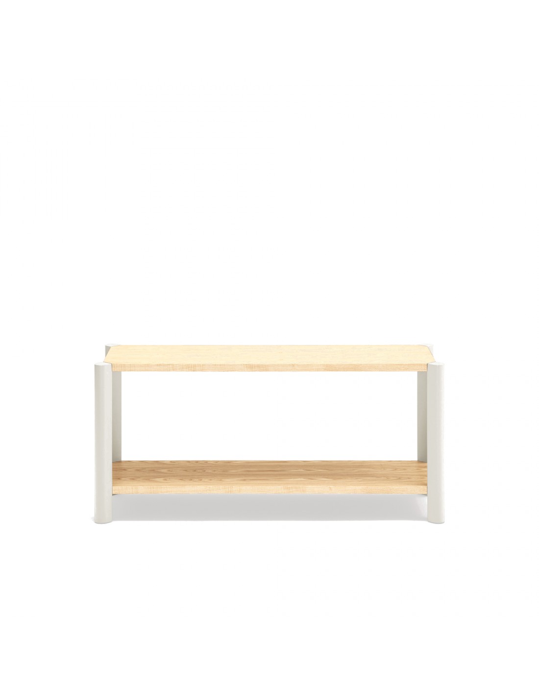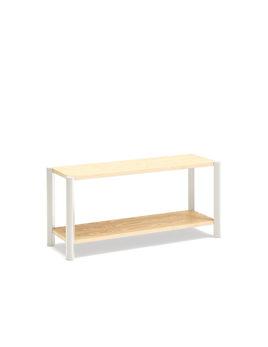 - Acabados combinados: estantes en madera natural y patas lacadas en tono crema.