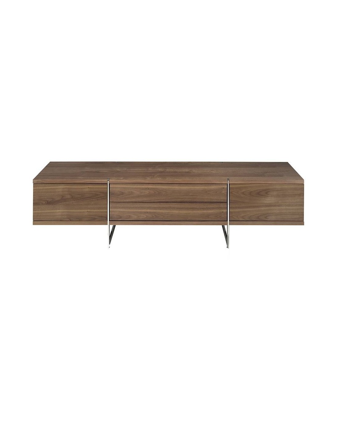 Mueble TV de diseño moderno fabricado en madera chapada en nogal natural de 0,5mm de espesor y unas originales patas en acero inoxidable cromado de 22 micras. Un mueble de televisión de estilo elegante y sofisticado perfecto para aportar el toque de calidez y estilo que buscas a tu salón, así como mantener todo en orden gracias a su gran espacio de almacenaje con dos puertas y dos cajones con sistema de cierre soft-closing. Este elegante Mueble TV de nogal aportará el toque sofisticado, moderno y minimalista que buscas para tu salón.