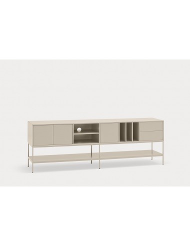Este mueble TV Platt de MDF lacado en crema, es una colección de estética limpia y contemporánea donde la funcionalidad es el centro del diseño. Con patas metálicas delgadas que le dan un toque elegante, ofrece varios espacios de almacenamiento, 3 puertas que ocultan espacios para guardar tus objetos, 2 estantes abiertos con un orificio para cables, ideal para tus dispositivos electrónicos, 3 cajones espaciosos para mantener todo en orden, 3 huecos y en la parte inferior cuenta con un estante abierto adicional para exhibir tus decoraciones favoritas.