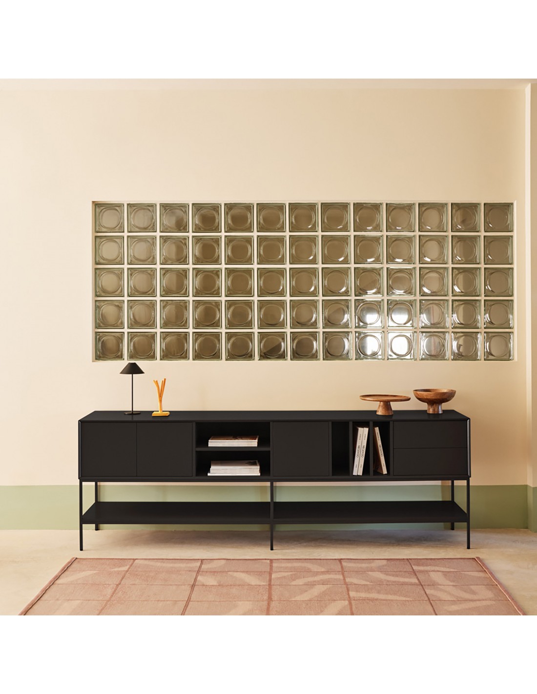 Este mueble TV Platt de MDF lacado en gris antracita, es una colección de estética limpia y contemporánea donde la funcionalidad es el centro del diseño. Con patas metálicas delgadas que le dan un toque elegante, ofrece varios espacios de almacenamiento, 3 puertas que ocultan espacios para guardar tus objetos, 2 estantes abiertos con un orificio para cables, ideal para tus dispositivos electrónicos, 3 cajones espaciosos para mantener todo en orden, 3 huecos y en la parte inferior cuenta con un estante abierto adicional para exhibir tus decoraciones favoritas.