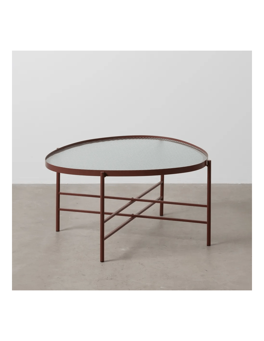Fabricada en metal con un acabado en color teja y equipada con un tablero de cristal, la mesa de centro Trixie destaca por su durabilidad y resistencia, además de aportar una estética industrial y contemporánea a cualquier ambiente. El cristal permite una visualización clara y añade un toque de ligereza y modernidad al diseño robusto de metal.