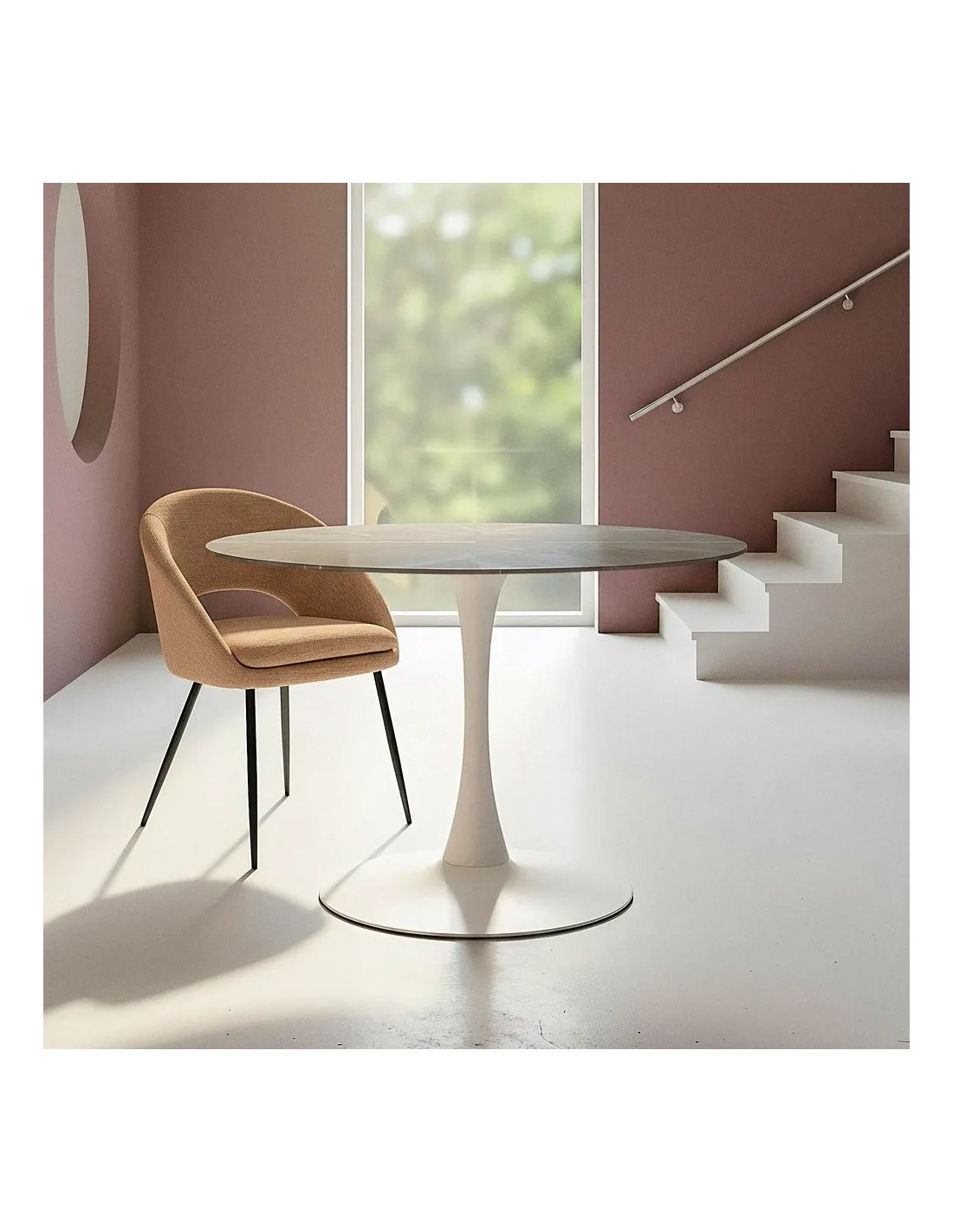 La Mesa redonda Oda de piedra sinterizada gris y base blanca es perfecta si buscas calidad, estilo contemporáneo y resistencia en un solo mueble. Una opción ideal para hogares modernos.