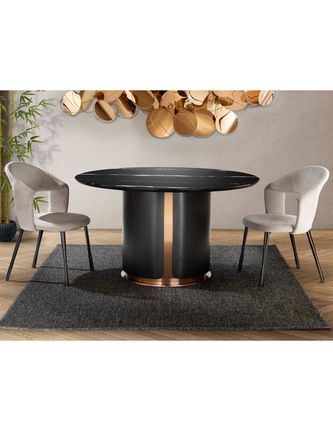 La Mesa de Comedor Redonda ZOLO de 135 cm, de Mármol y Roble Oscuro con Base Oro Rosa es una pieza que combina lujo, funcionalidad y diseño contemporáneo. Fabricada con materiales de alta gama, es ideal para quienes desean transformar su comedor en un espacio sofisticado y acogedor.