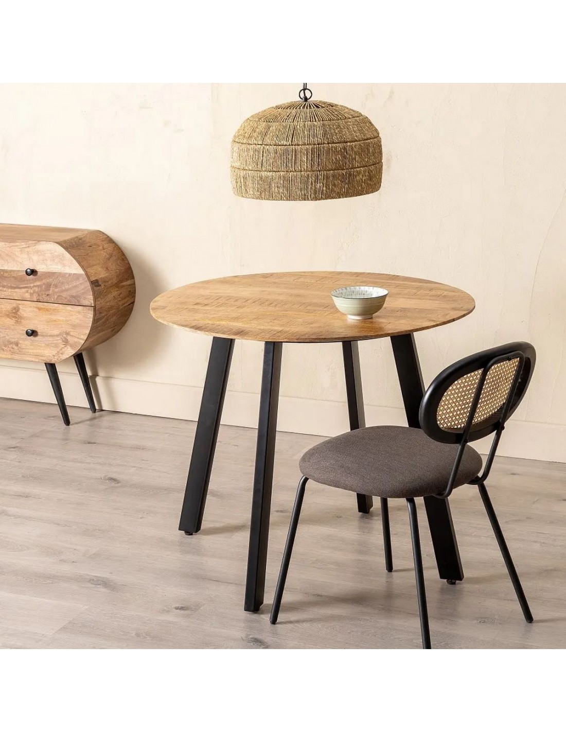 La Mesa LYON está diseñada para adaptarse a espacios compactos sin renunciar al diseño. Su tablero redondo de 90 cm en madera de mango natural aporta un toque cálido y auténtico que encaja en ambientes nórdicos, industriales o modernos. Las patas metálicas negras, ligeramente inclinadas, aportan firmeza estructural y un look sofisticado.