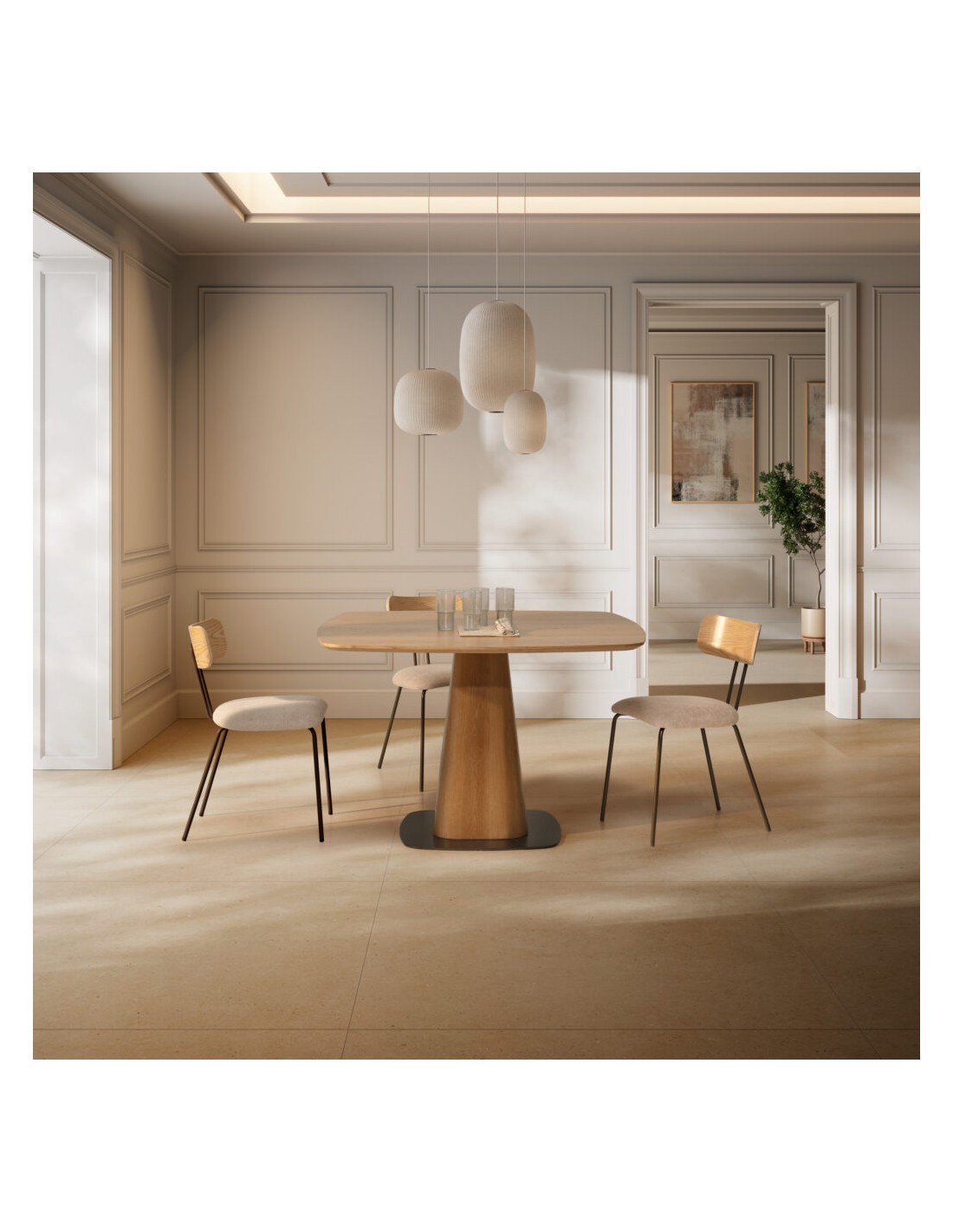 El acabado sobre chapa natural de roble realza la veta de la madera y aporta profundidad visual. La base central, sólida y escultórica, ofrece estabilidad y libera espacio para las piernas, mejorando la comodidad de los comensales.