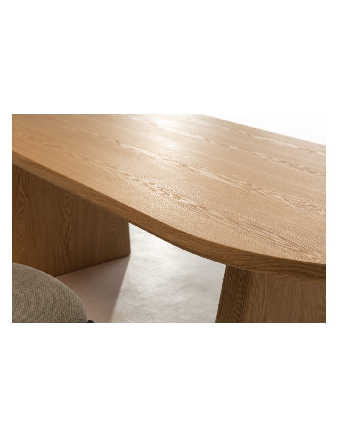 Las mesas ovaladas tienen una larga tradición en el diseño europeo por su capacidad para combinar la elegancia de las líneas curvas con la practicidad de una gran superficie. En la BLAIR, el acabado natural en chapa de fresno realza la veta de la madera y aporta luminosidad, creando un ambiente acogedor y contemporáneo.