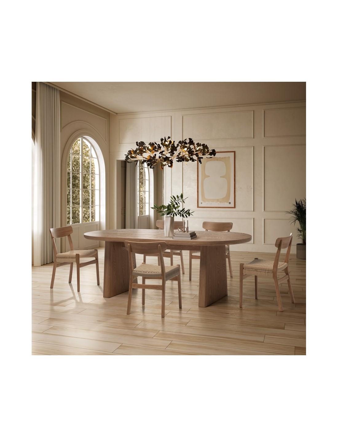 En un comedor de 28-35 m², la Mesa BLAIR permite colocar 8 sillas con comodidad y mantener una sensación de amplitud visual. Combinada con una lámpara suspendida centrada y un aparador en tonos naturales, crea un ambiente equilibrado y sofisticado.