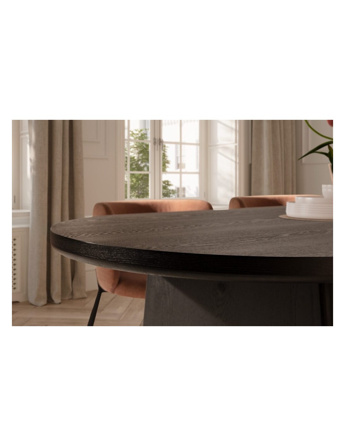 Las mesas ovaladas tienen una larga tradición en el diseño europeo por su capacidad para combinar la elegancia de las líneas curvas con la practicidad de una gran superficie. En la BLAIR, el acabado negro en chapa de fresno realza la veta de la madera y aporta luminosidad, creando un ambiente acogedor y contemporáneo.