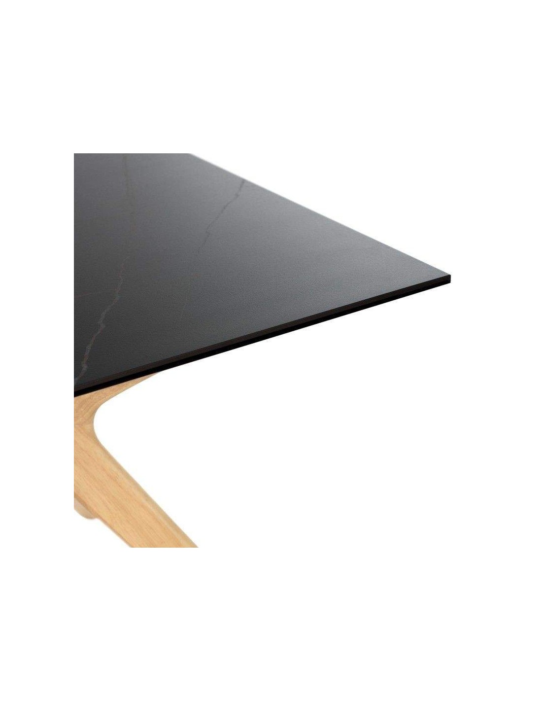 Mesa de comedor fija con tapa 160x90 cm porcelánico (porcelánico 5mm + cristal templado 8mm) y patas de madera terminado en roble. Porcelánico resistente al rayado, calor, fuego, productos químicos, etc. Superficie higiénica.