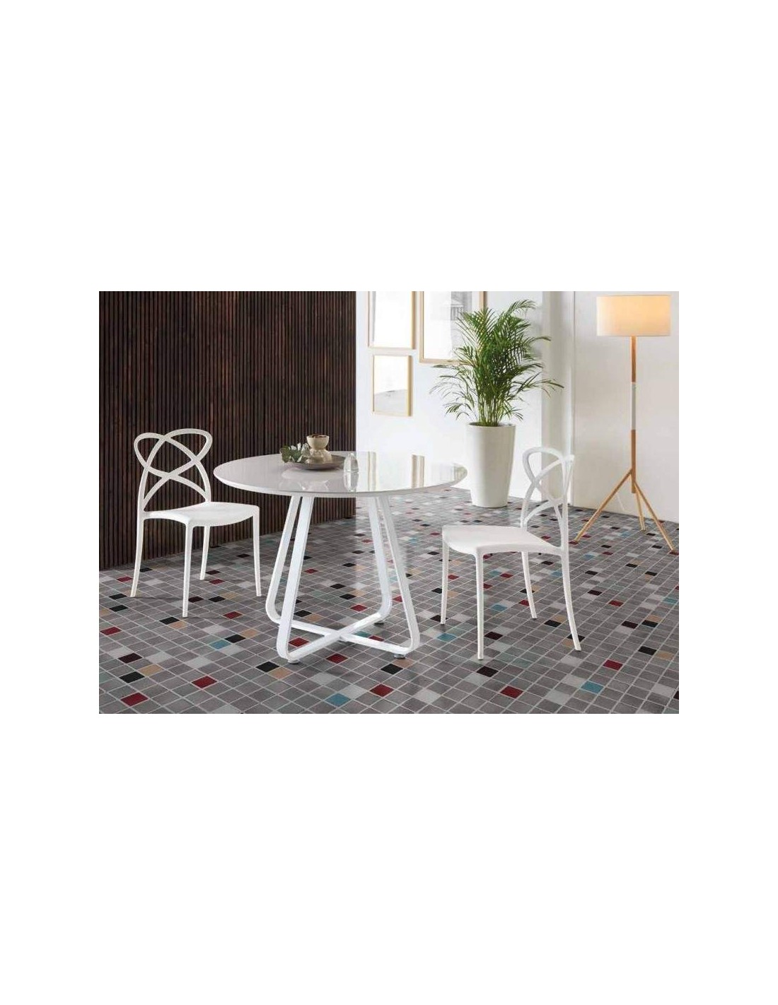 Mesa de diseño moderno con tapa en DM lacada color blanco y patas de metal lacado blanco.