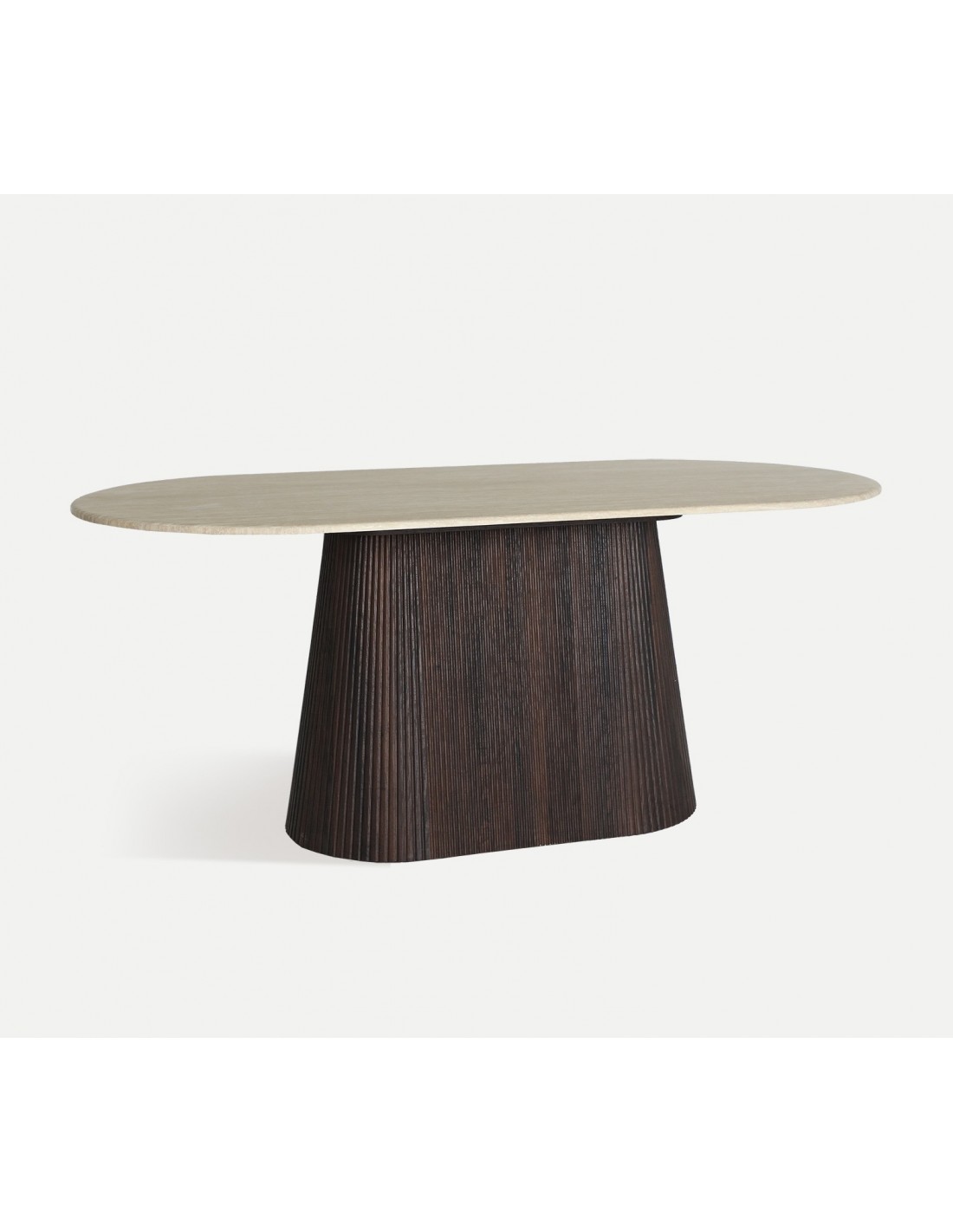 Verona | Madera nogal + mármol beige | 6–8 personas | Diseño escultural y gran resistencia |