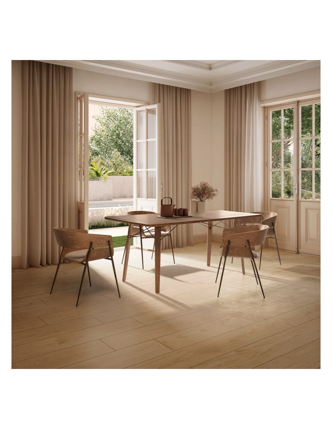 En un comedor de 24 m², la Mesa LUJAN permite colocar 6 sillas amplias con comodidad. Combinada con lámparas colgantes negras y textiles neutros, crea un ambiente moderno, luminoso y acogedor.