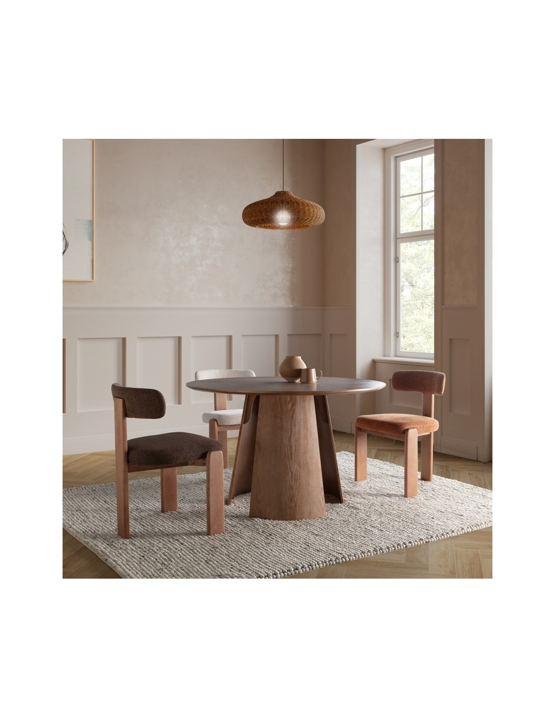 En un comedor de 20 m², la mesa ZURI en roble combinada con sillas en tonos beige o gris claro crea un ambiente cálido y equilibrado. Una lámpara colgante centrada potencia su forma redonda y armoniza el conjunto.
