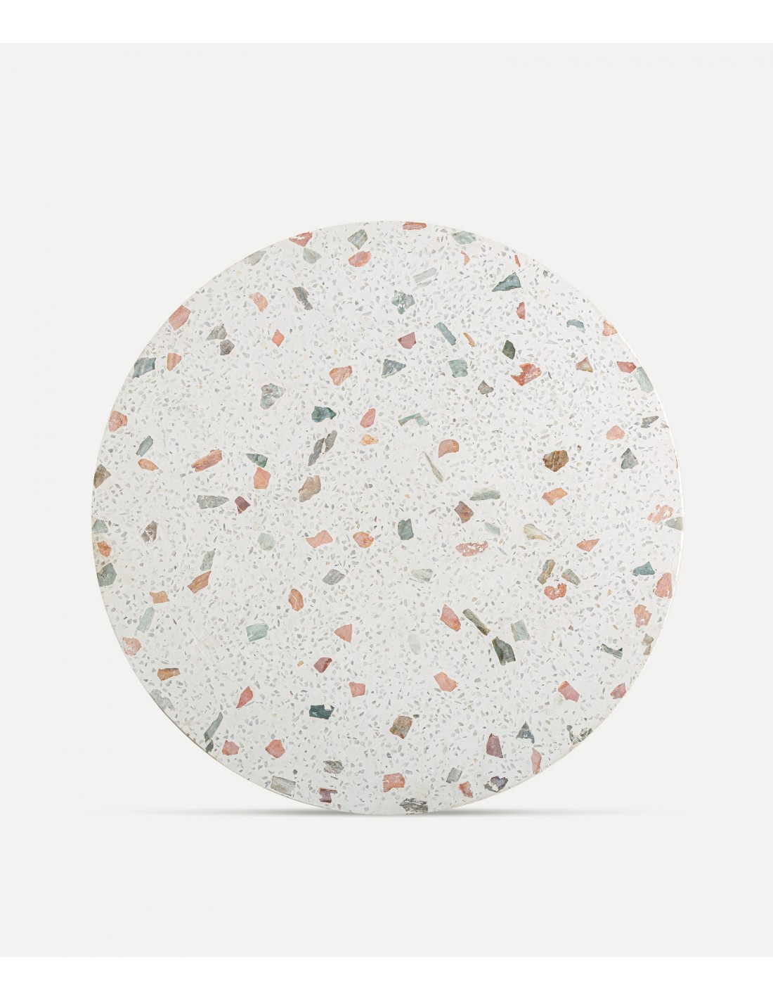 El terrazzo blanco roto —una mezcla de mármoles naturales y cemento— aporta una superficie visualmente rica y duradera, reminiscente de los clásicos tableros italianos del siglo XX. Combinado con la calidez de la madera de mango, se crea un diálogo armónico entre lo artesano y lo contemporáneo.