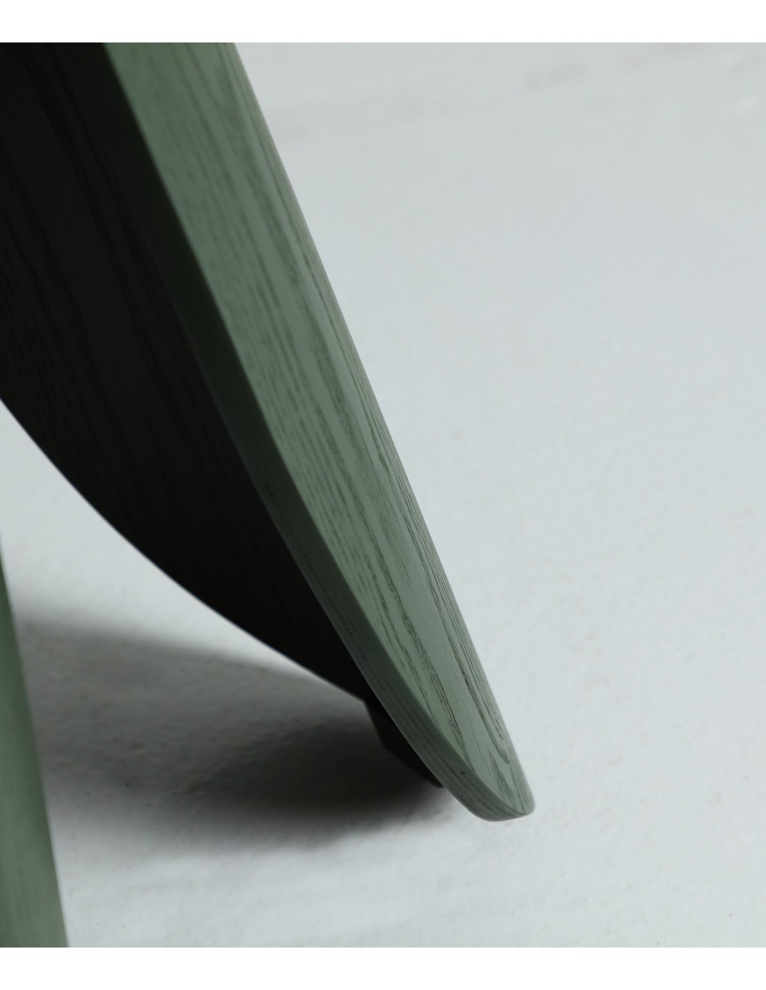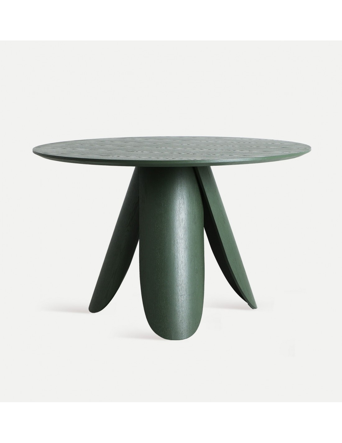 La mesa de comedor DORSTEN combina madera de fresno con acabado mate verde y un diseño orgánico de inspiración escultórica. Su base curvada, que recuerda a pétalos en movimiento, aporta modernidad, fluidez y carácter a cualquier comedor sofisticado.
