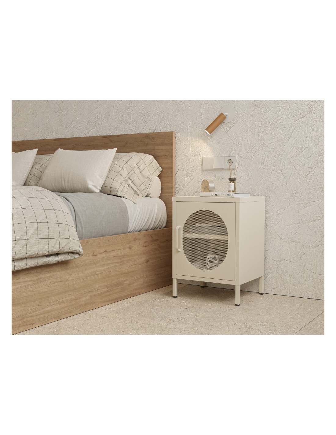 Imagina un dormitorio con mobiliario blanco, textiles neutros y detalles metálicos. La mesita DIORA en color crema aporta luminosidad y calma, mientras su puerta reversible crea funcionalidad adaptada. Su espíritu minimalista conecta con la estética escandinava y la tendencia “slow living” actual: menos es más, calidad sobre cantidad.