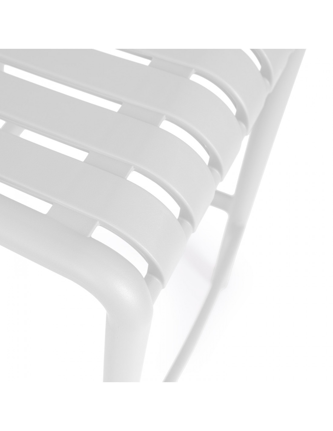 Su forma curvada y respaldo envolvente lo hacen especialmente cómodo frente a modelos sin respaldo. El diseño con lamas separadas mejora la ventilación, ideal para climas cálidos o cocinas cerradas.
