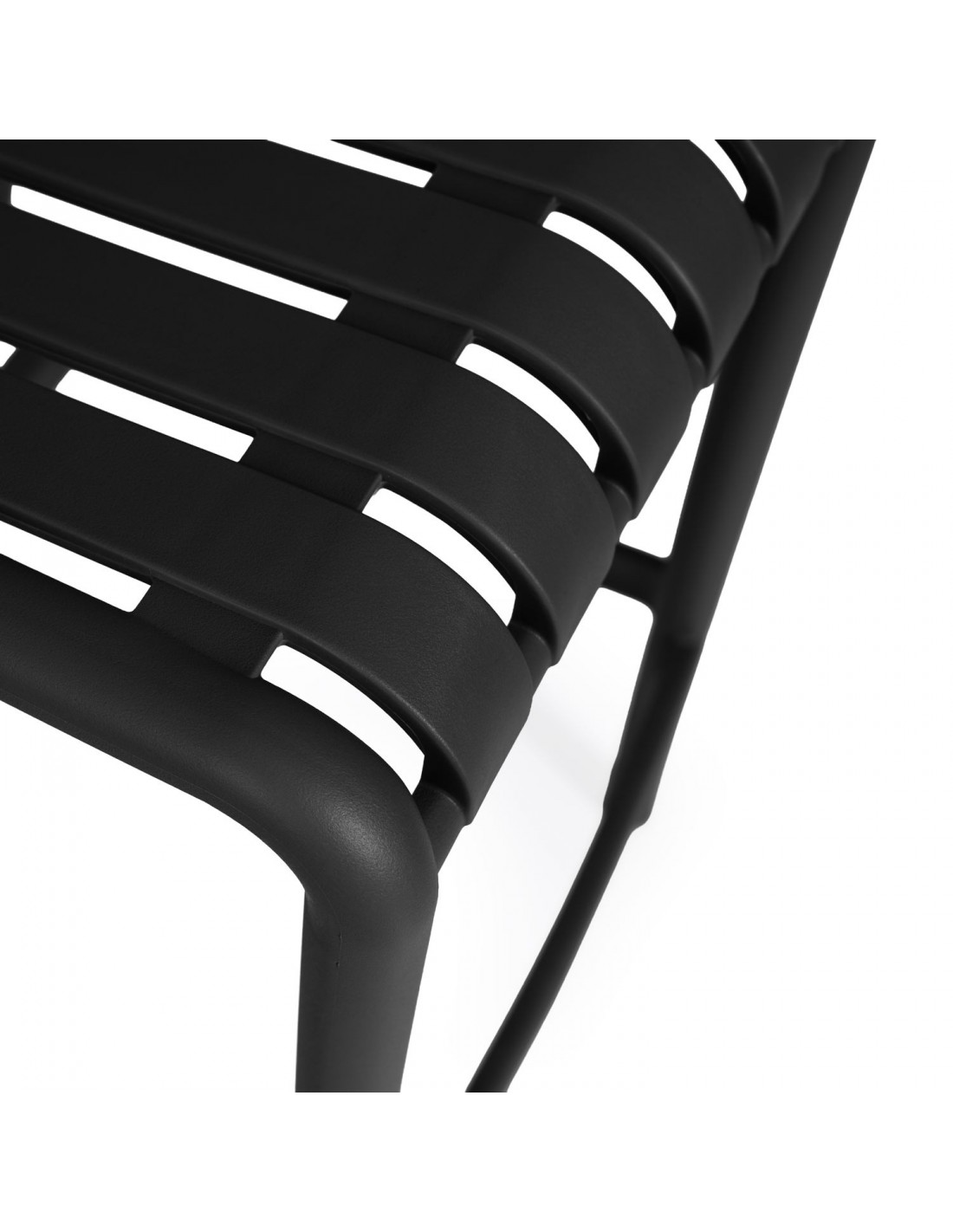 Su forma curvada y respaldo envolvente lo hacen especialmente cómodo frente a modelos sin respaldo. El diseño con lamas separadas mejora la ventilación, ideal para climas cálidos o cocinas cerradas.