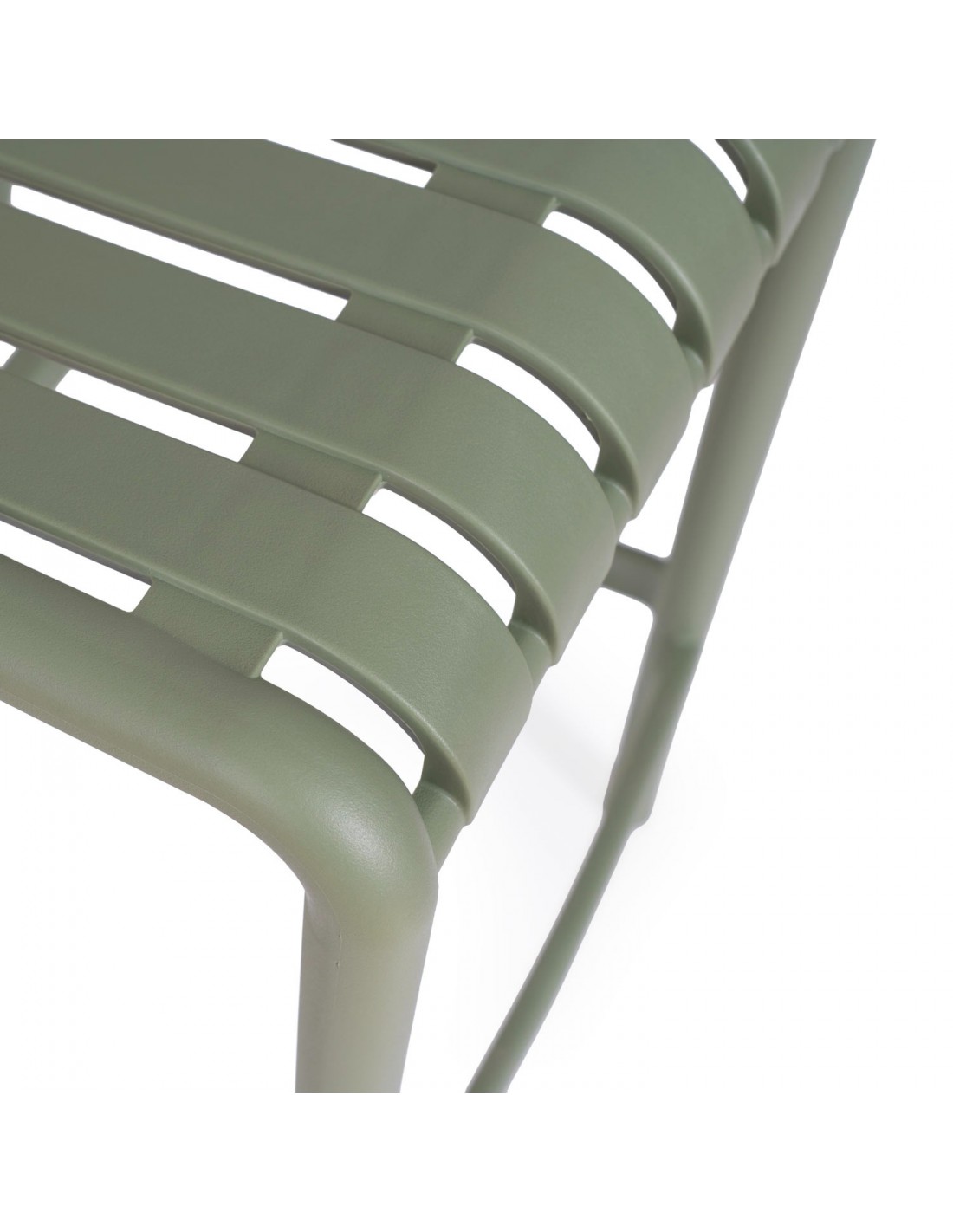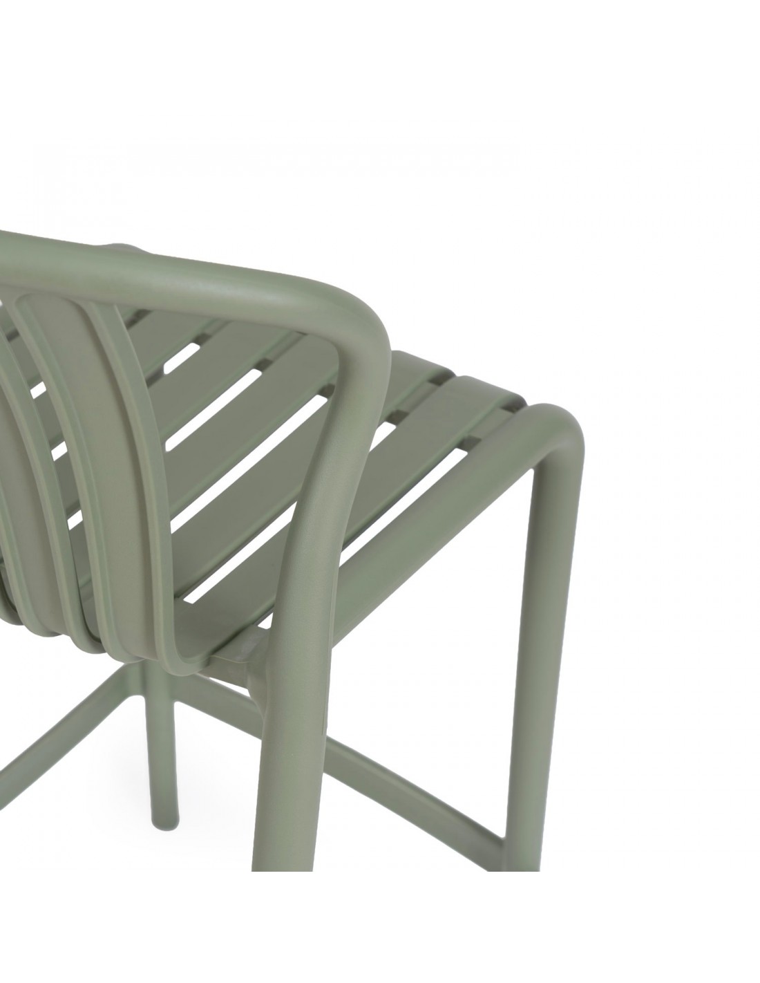 Su forma curvada y respaldo envolvente lo hacen especialmente cómodo frente a modelos sin respaldo. El diseño con lamas separadas mejora la ventilación, ideal para climas cálidos o cocinas cerradas.