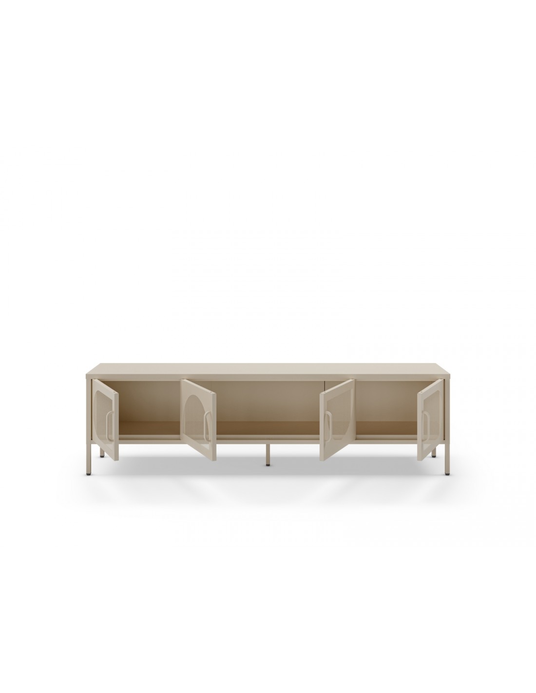El Mueble de TV metálico minimalista TAYRA 180 cm con 4 puertas destaca por su diseño moderno, líneas limpias y estructura de metal lacado. Inspirado en la estética industrial contemporánea, combina funcionalidad y estilo para convertirse en una pieza clave del salón. Su longitud de 180 cm lo hace perfecto para televisores grandes, mientras que sus cuatro puertas con rejilla aportan un toque distintivo y facilitan la ventilación interior, ideal para consolas, routers y otros dispositivos electrónicos.