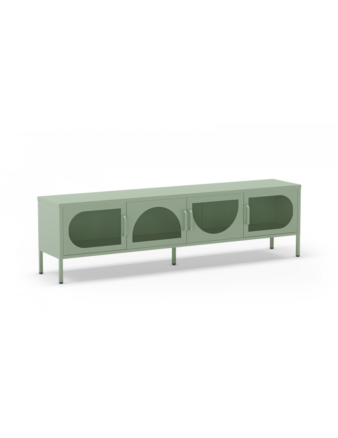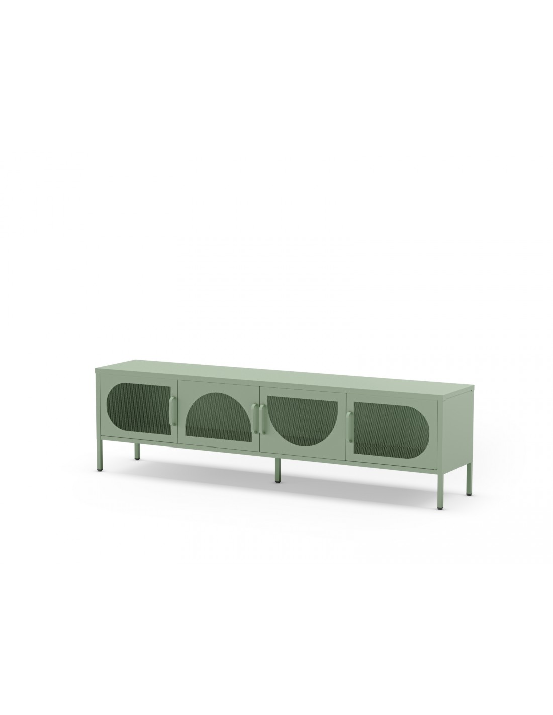 El Mueble de TV metálico minimalista TAYRA 180 cm con 4 puertas destaca por su diseño moderno, líneas limpias y estructura de metal lacado. Inspirado en la estética industrial contemporánea, combina funcionalidad y estilo para convertirse en una pieza clave del salón. Su longitud de 180 cm lo hace perfecto para televisores grandes, mientras que sus cuatro puertas con rejilla aportan un toque distintivo y facilitan la ventilación interior, ideal para consolas, routers y otros dispositivos electrónicos.