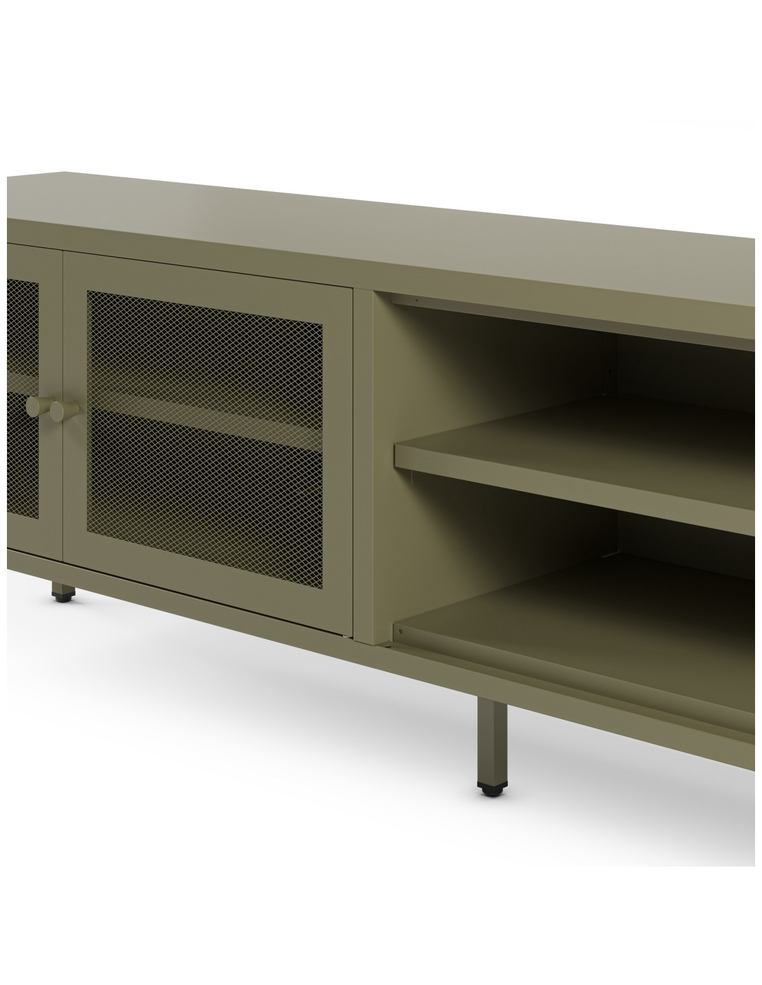 Mueble de TV metálico minimalista FAYNA en verde, 160 cm con 2 puertas y 2 huecos