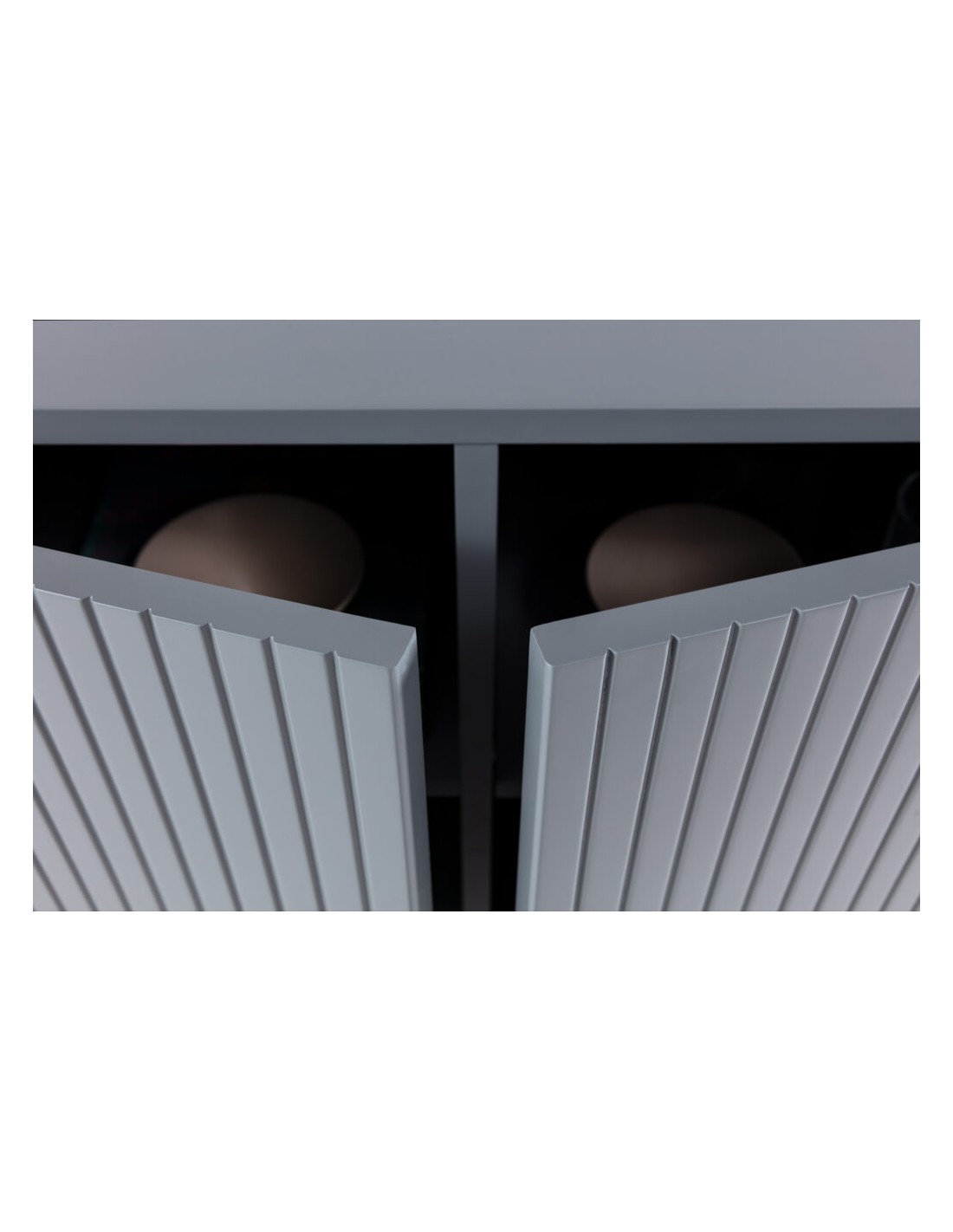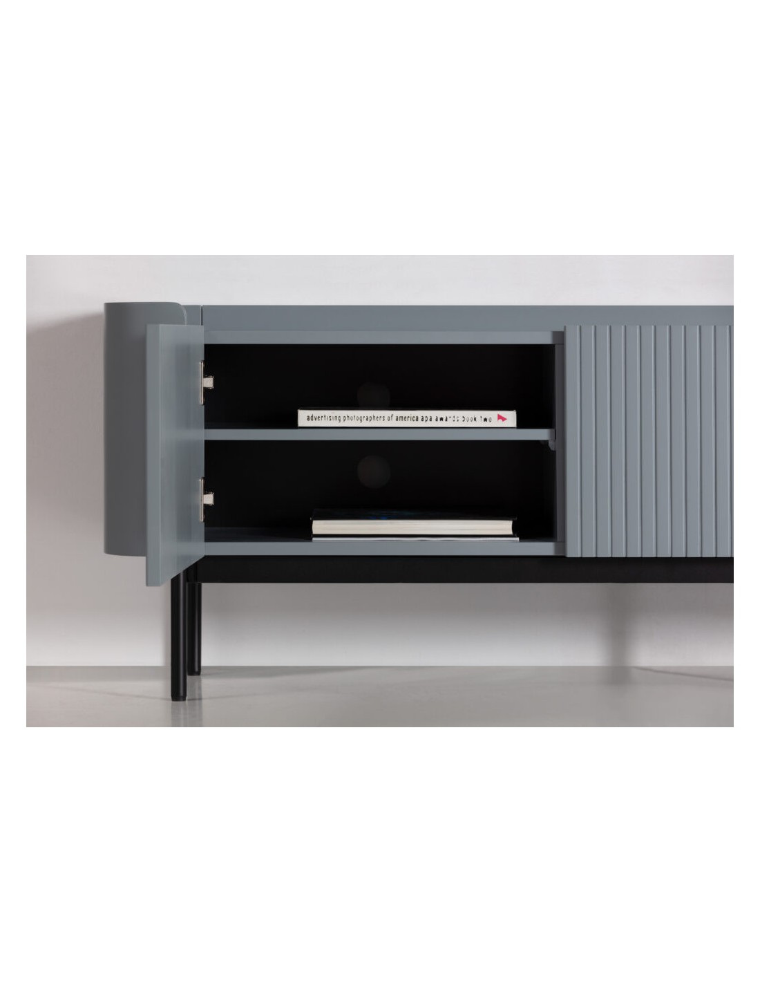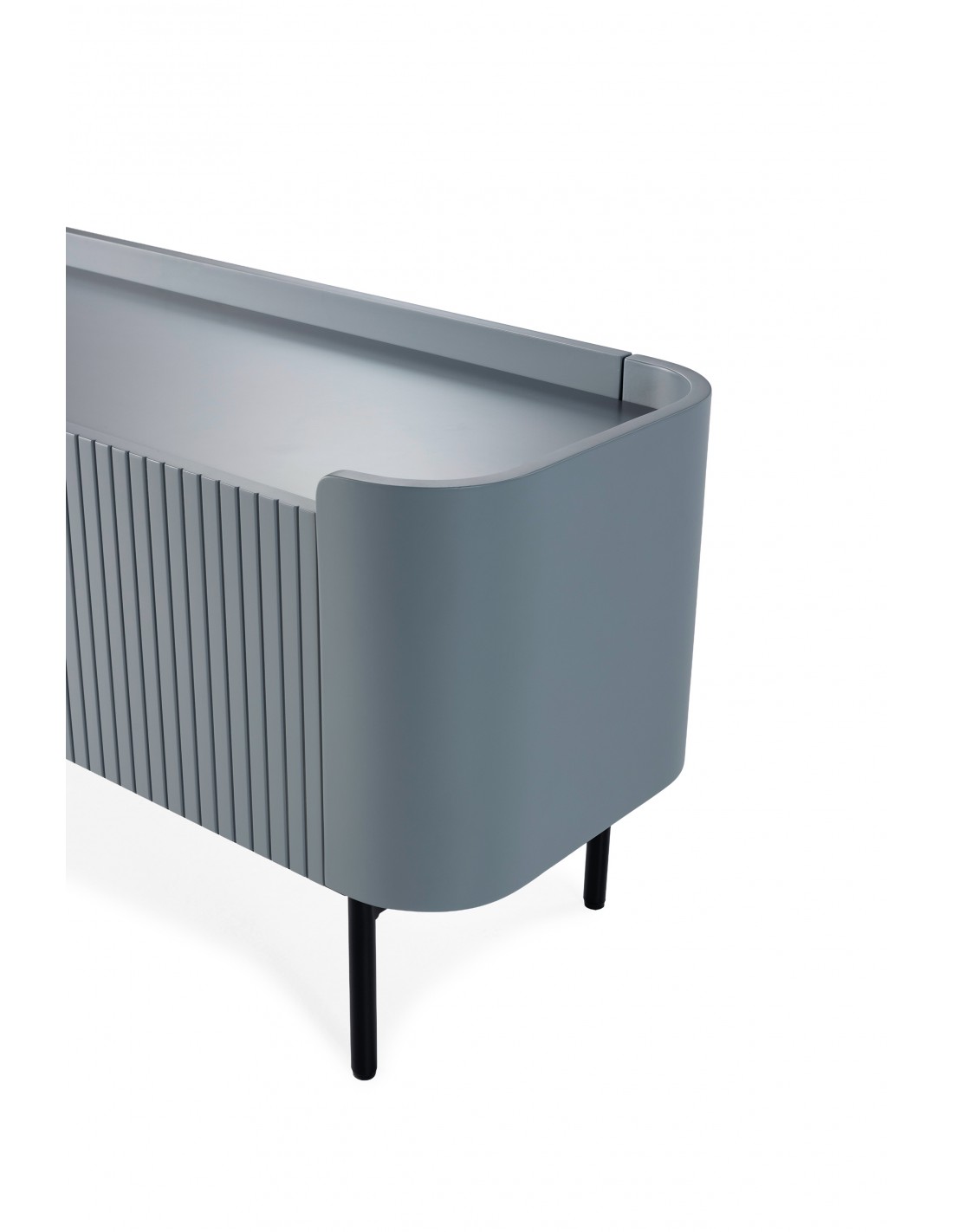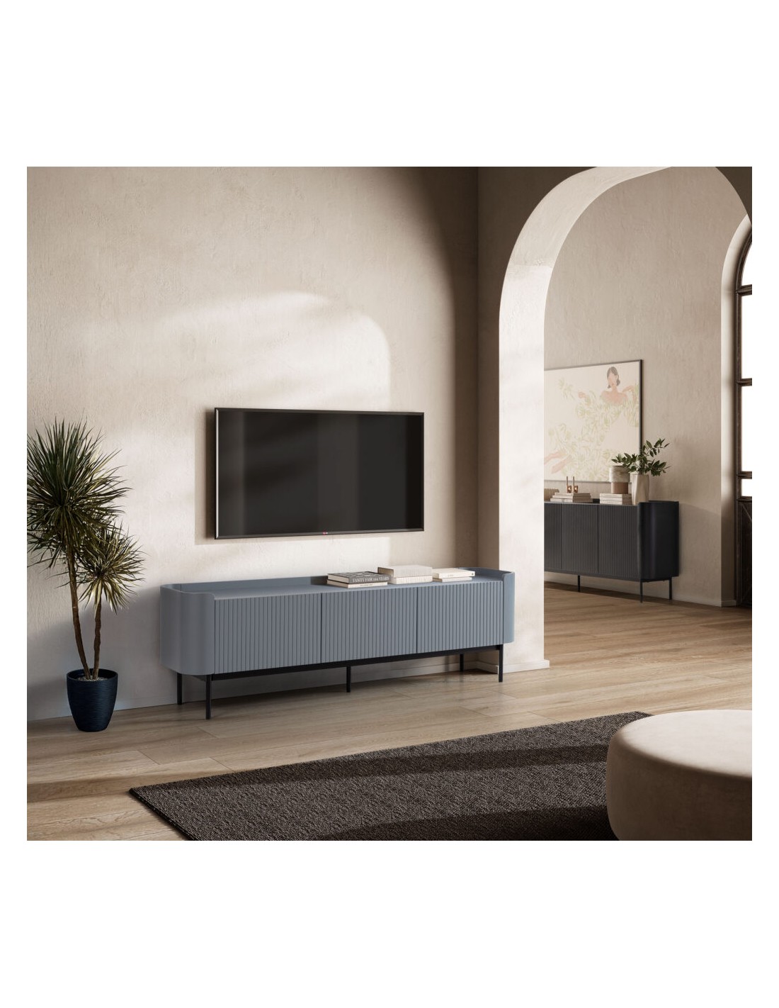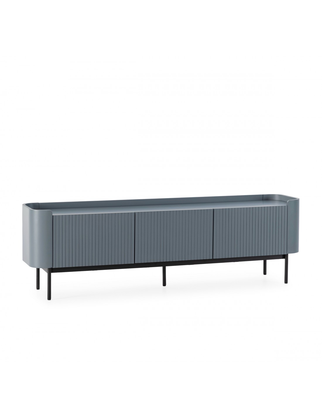 El Mueble TV WILLA en MDF azul destaca por su estética contemporánea y minimalista. Su diseño con líneas verticales en el frontal crea una textura elegante que aporta dinamismo visual sin sobrecargar el espacio.