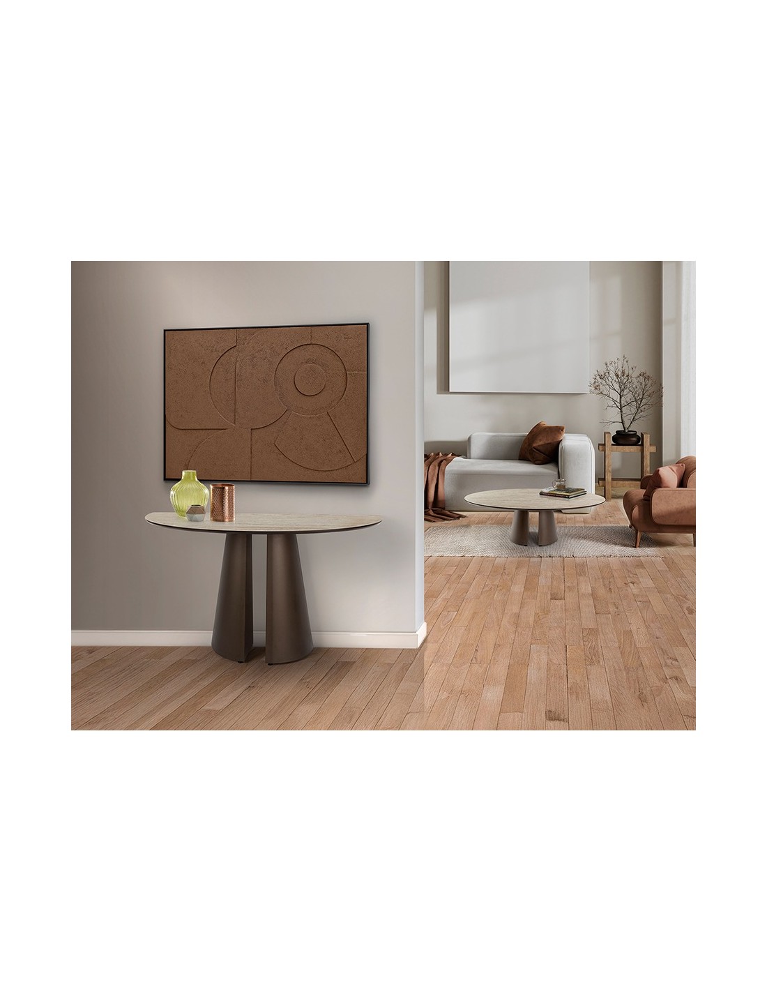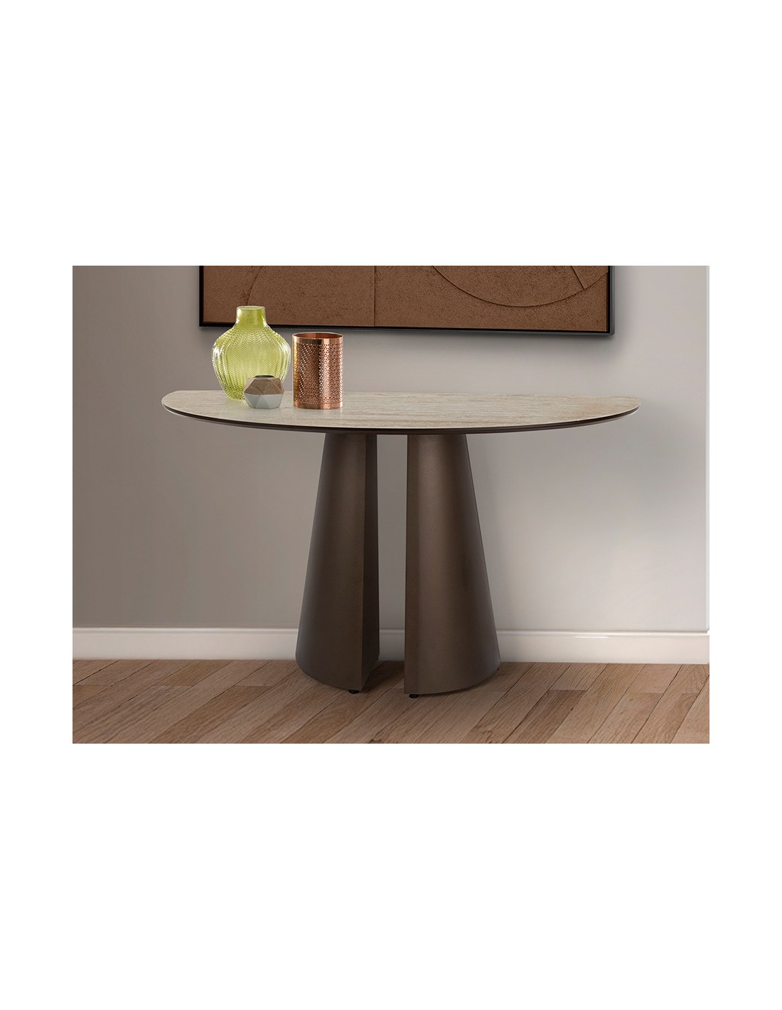 La consola SAMARA representa la fusión entre inspiración natural y diseño industrial. Su tapa en acabado travertino mate evoca la textura y serenidad de la piedra caliza italiana, mientras que su estructura metálica en marrón óxido aporta carácter y modernidad. Una combinación que no solo decora, sino que transforma el espacio.