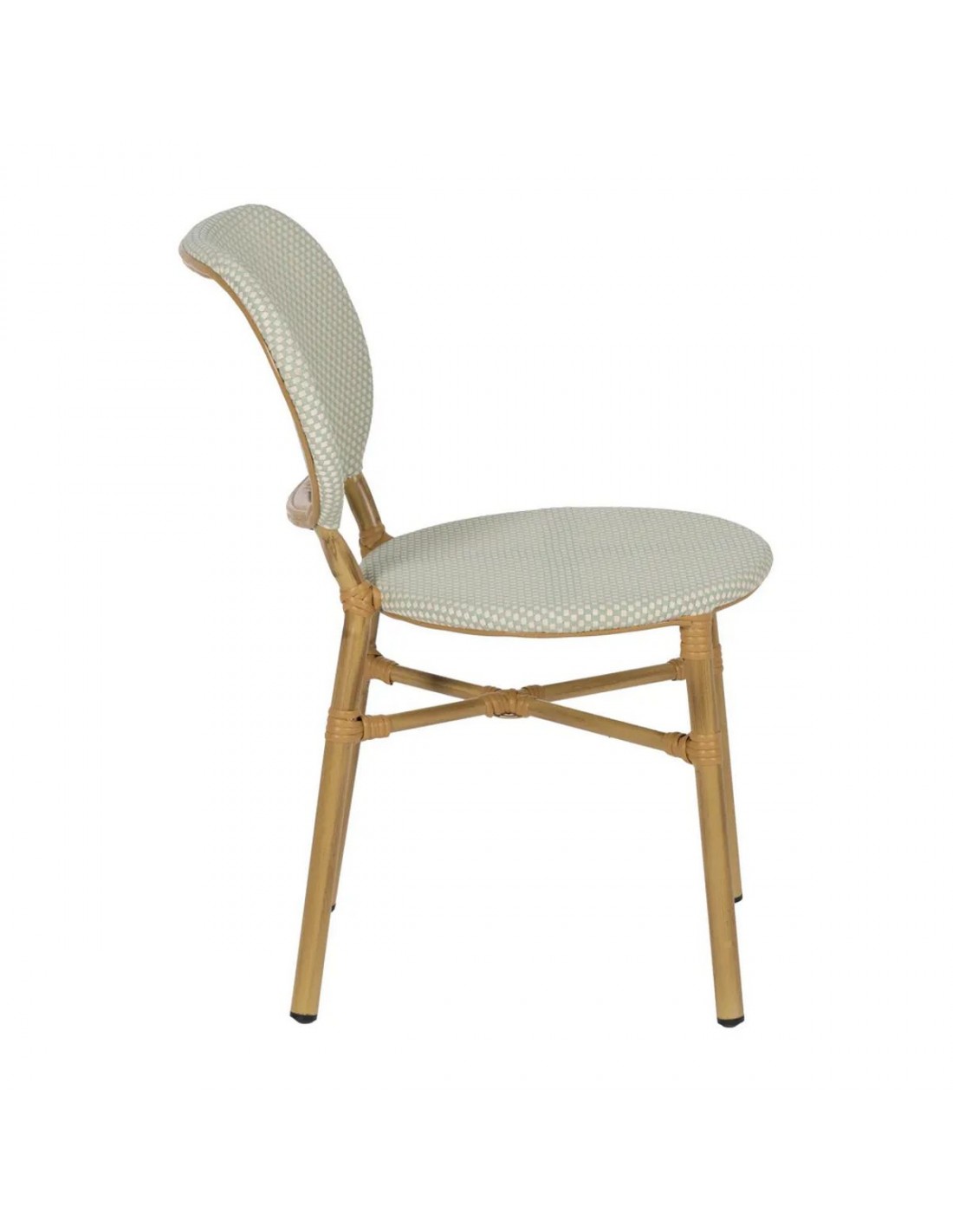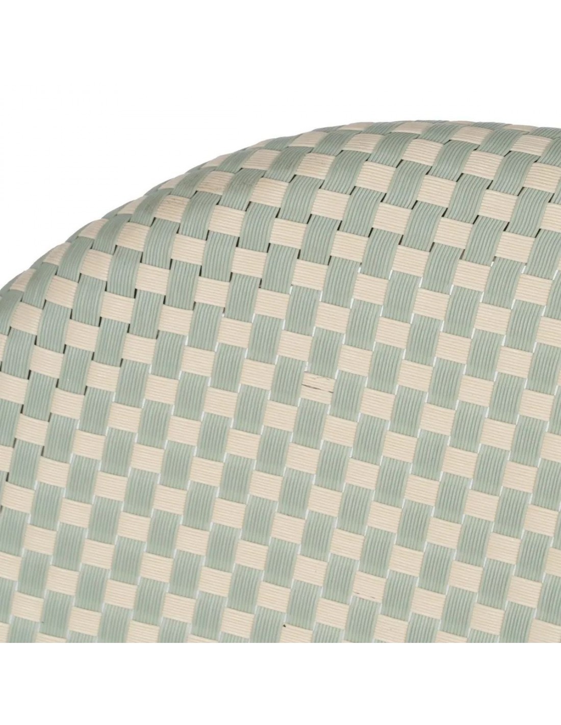 El aguamarina de la BREEZE evoca la calma de las terrazas mediterráneas y la frescura de ambientes costeros. Su diseño limpio la hace perfecta para integrarse en espacios de hostelería, patios privados o comedores al aire libre. La elección de aluminio y textileno no es casual: son materiales usados históricamente en mobiliario náutico por su resistencia y ligereza.