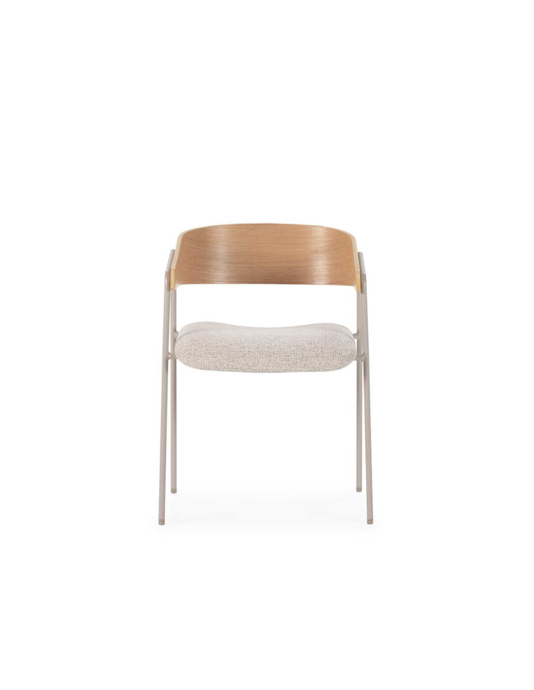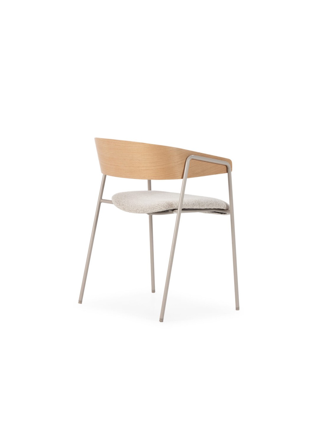 El tapizado en tono beige aporta luminosidad y amplitud visual, mientras que el respaldo acabado en roble introduce una nota natural que evoca el diseño nórdico de mediados del siglo XX. Las patas de metal gris añaden un contrapunto contemporáneo y garantizan estabilidad estructural.