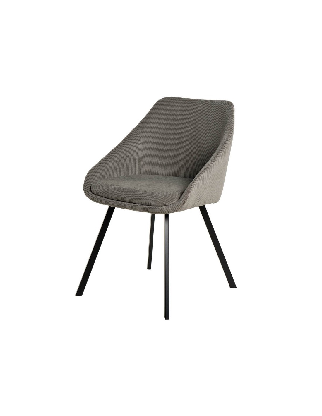 Silla tapizada con tela pana en color gris claro y patas de metal.