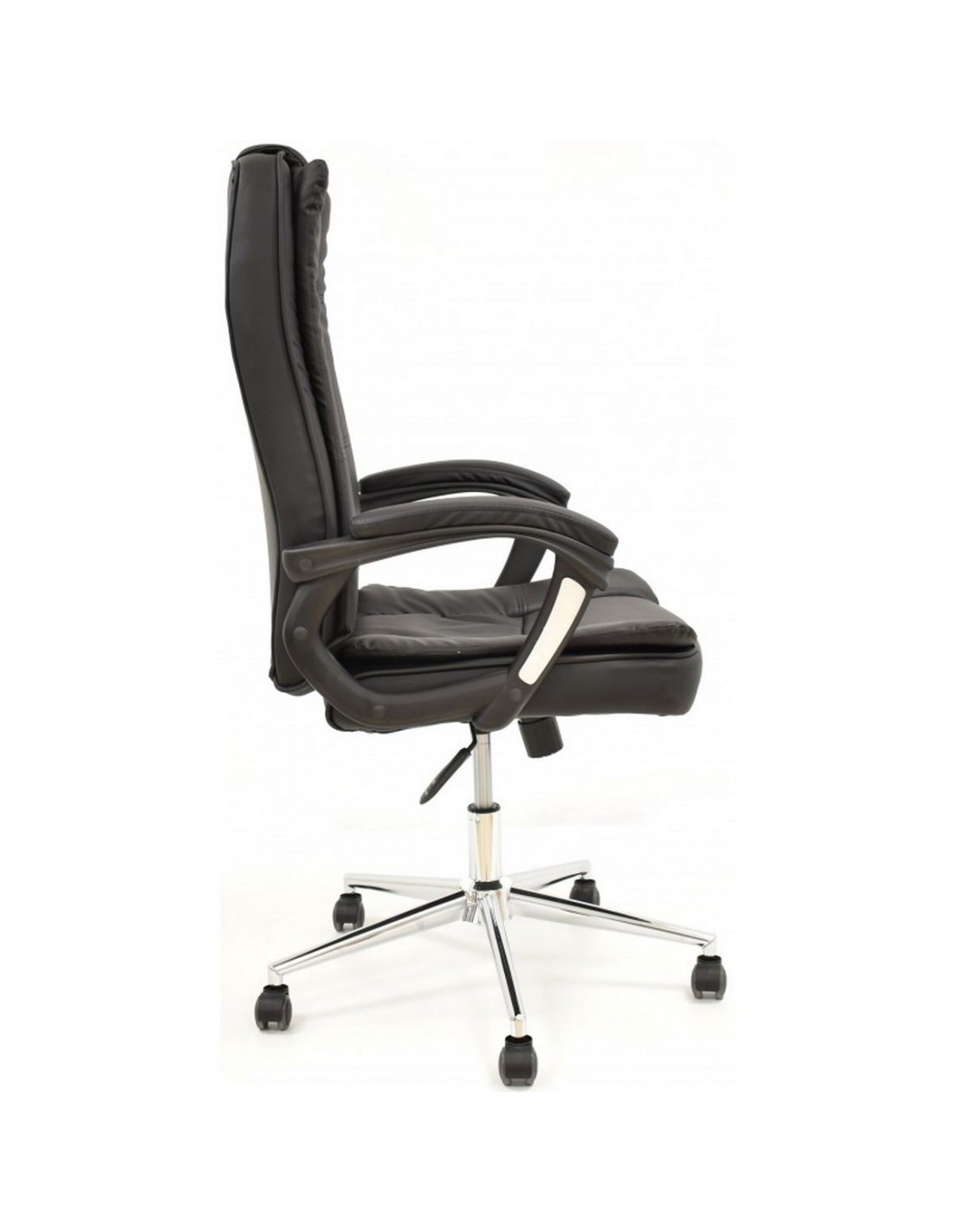 Para entornos de trabajo con estilo y exigencia, el sillón de oficina KEDU destaca por su respaldo alto, sistema de elevación mediante gas y mecanismo basculante suave, todo en un acabado en similpiel negra sobre una base de acero cromado.