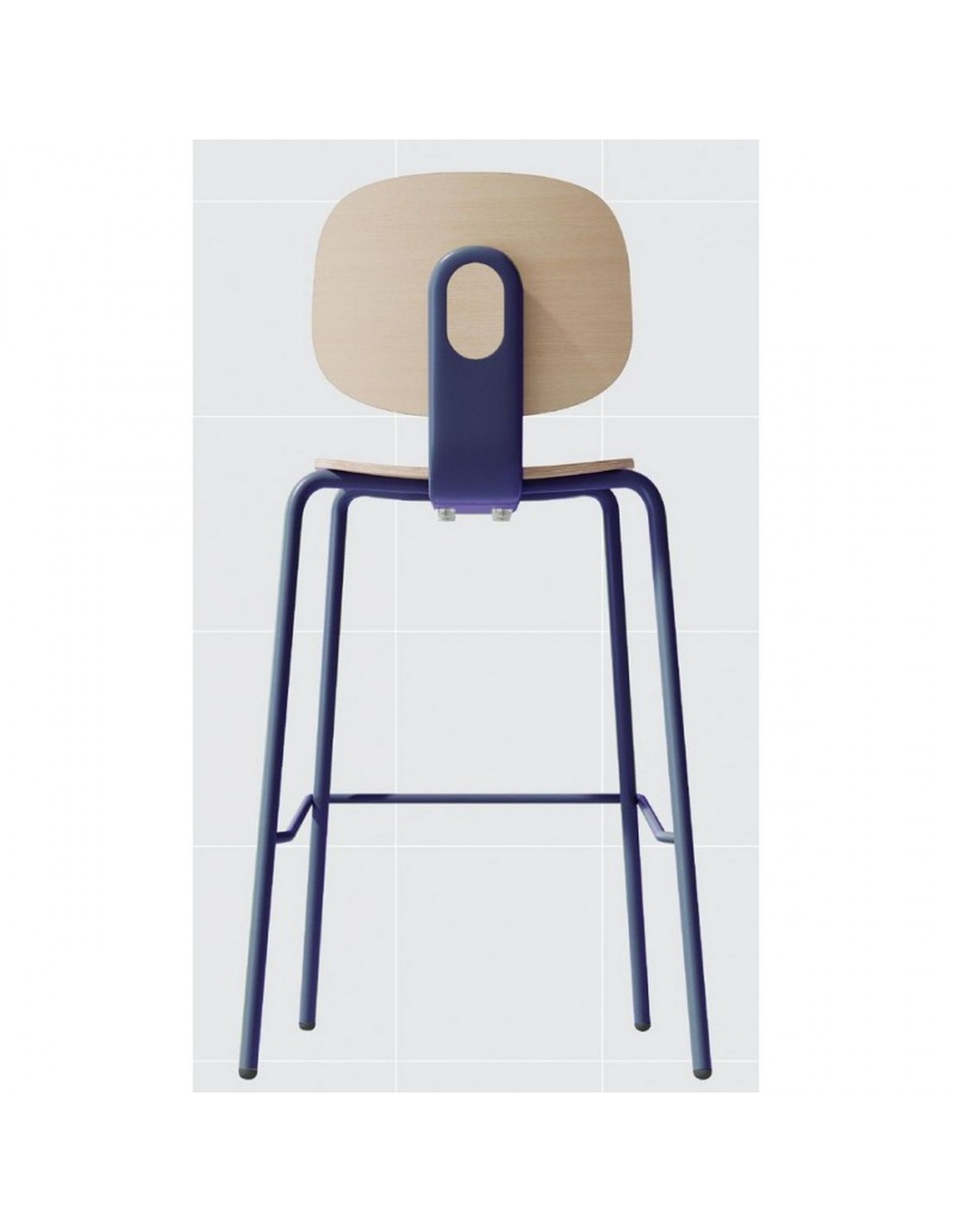 El Taburete Retro Schooly de 74cm rescata el carácter de los taburetes escolares clásicos de mediados del siglo XX, actualizándolo para cocinas, bares y espacios contemporáneos. Su estructura metálica tubular azul con pintura epoxi aporta solidez, mientras que el asiento y respaldo en contrachapado revestido con HPL natural ofrecen resistencia y confort ergonómico.