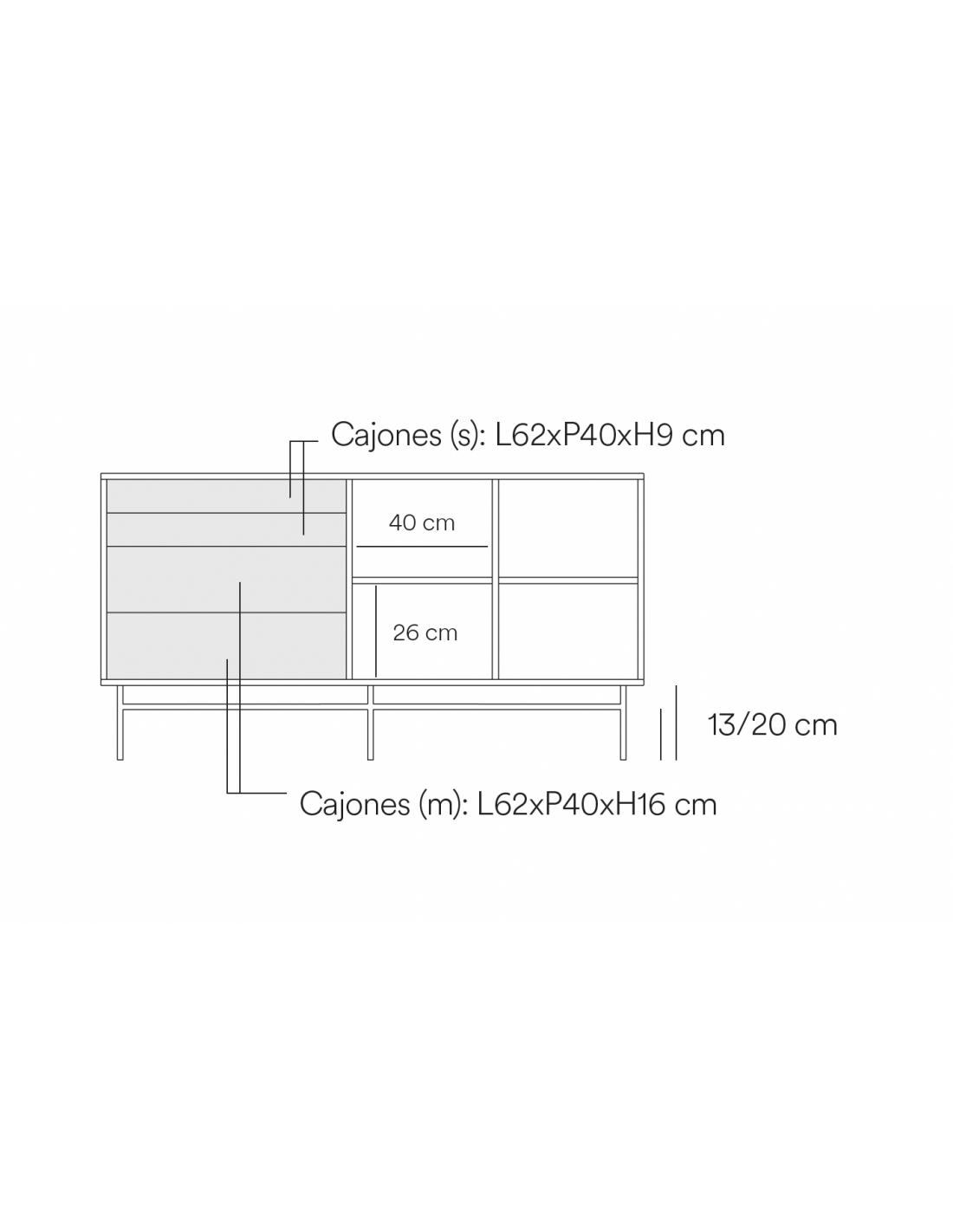 El aparador Punto 2 consta de dos puertas y cuatro cajones. En el interior encontramos dos baldas, complementando así el amplio espacio de almacenamiento del mueble.