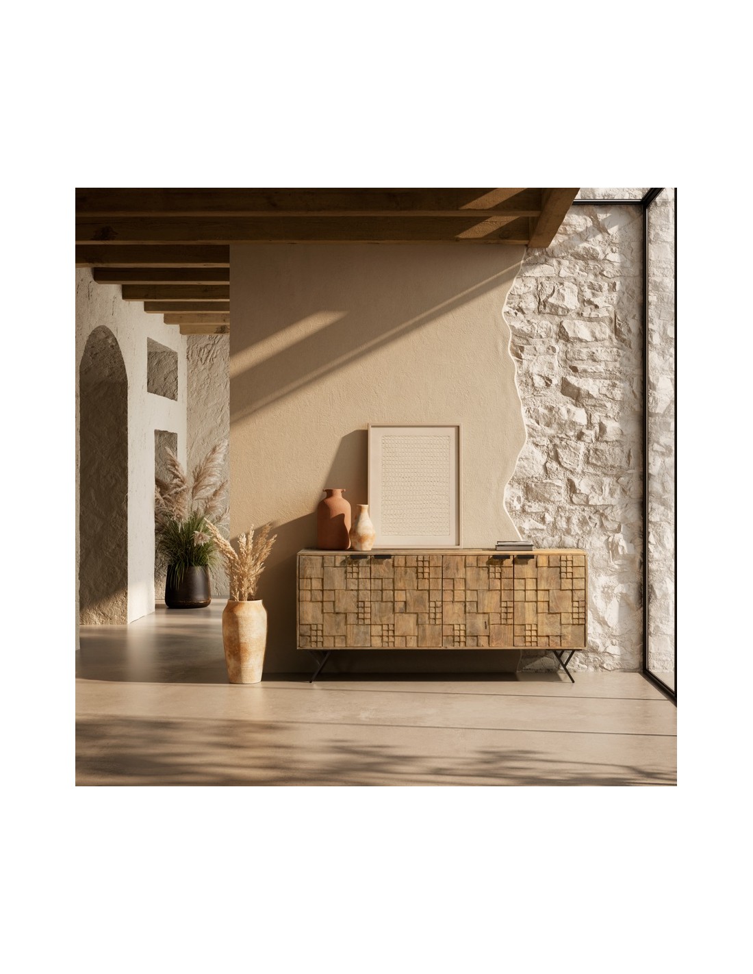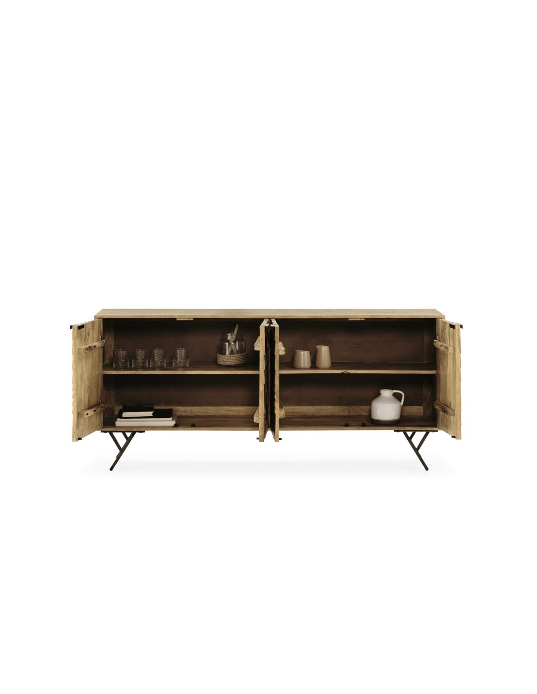 - Portas entalhadas à mão: padrão geométrico que valoriza o artesanato e transforma o móvel em protagonista visual.