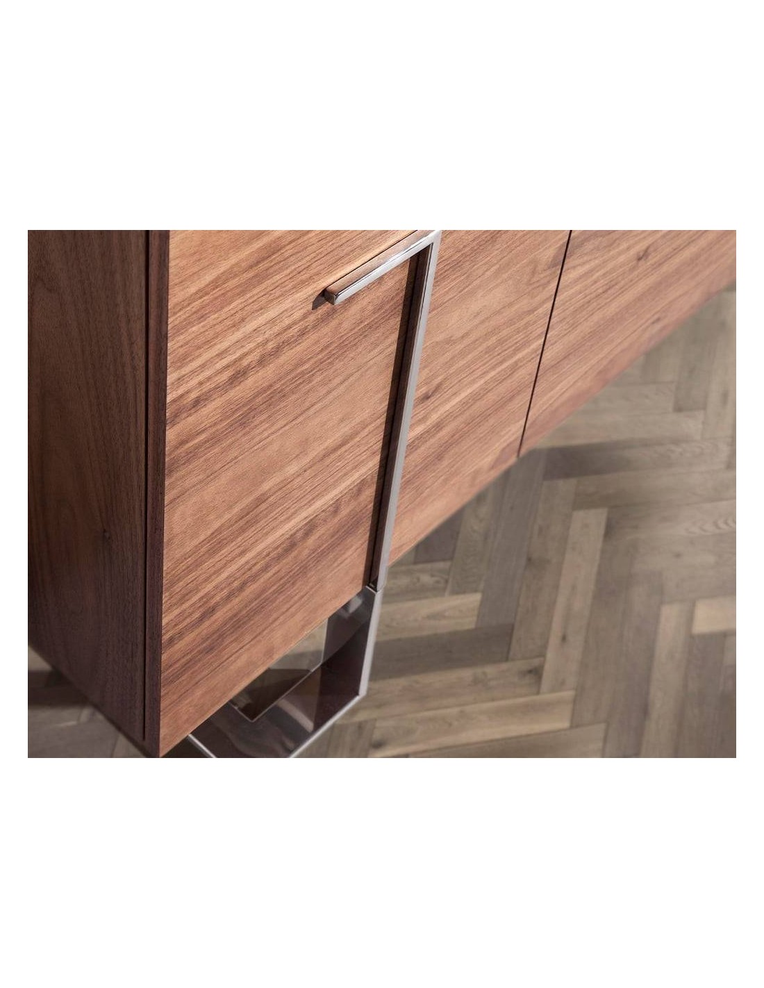 Aparador de design moderno em madeira folheada a nogueira. Seus detalhes e estrutura de pernas em aço inox cromado proporcionam aquele toque minimalista e industrial ao móvel. É um aparador que destaca a praticidade e funcionalidade, graças aos seus dois armários com prateleiras interiores, perfeitos para guardar tudo o que necessita.