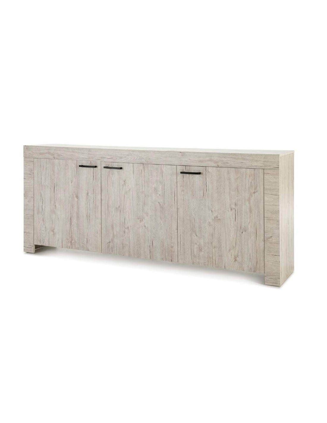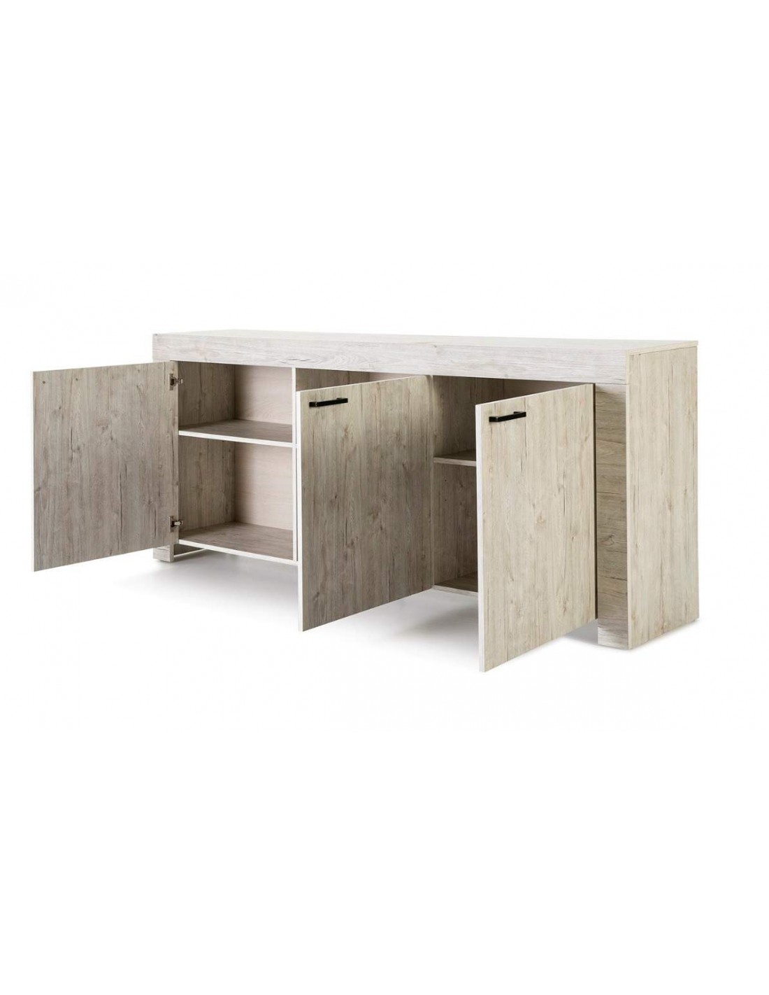 O Aparador MICHIGAN de estilo contemporâneo é composto de duas portas e três gavetas. É fabricado em MDF e acabamento em chapa sintética de cor carvalho branqueado. Seu Design robusto e de linhas retas se encaixam em ambientes modernos ou claro estilo nórdico. Altura: 85 cm Largura:150cm. Profundo:42cm.