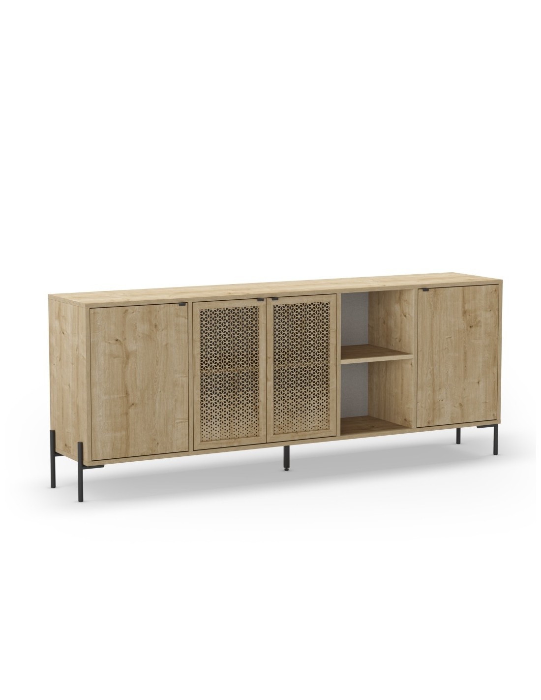 O Aparador INCA é um móvel deslumbrante que combina a estética rústica com a funcionalidade moderna, perfeito para qualquer casa que aprecia o design clássico com um toque contemporâneo. Com 203,8 cm de comprimento, este aparador oferece amplo espaço de arrumação graças às suas quatro portas e dois espaços abertos, ideal para expor objetos decorativos ou guardar utensílios domésticos essenciais, com pés em metal preto, proporcionando um contraste estético que reforça a sua presença em qualquer espaço.