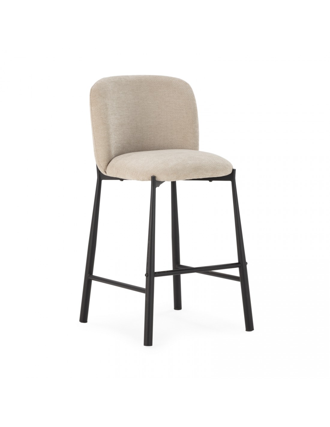 A estrutura em metal preto confere um aspeto contemporâneo e resistente, enquanto o assento em tecido suaviza visualmente o conjunto. A inspiração vem do estilo industrial-chic, perfeito para cozinhas abertas, lofts ou salas integradas.