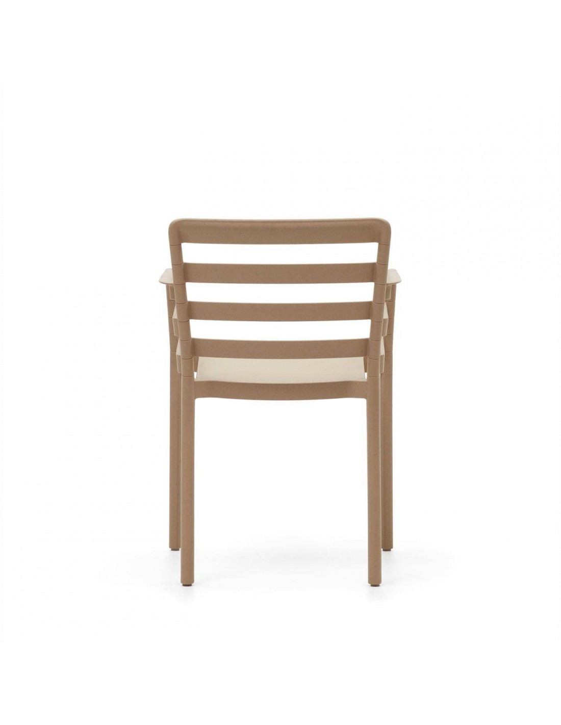Cadeira exterior de plástico para empilhável bege Nariet com braços.