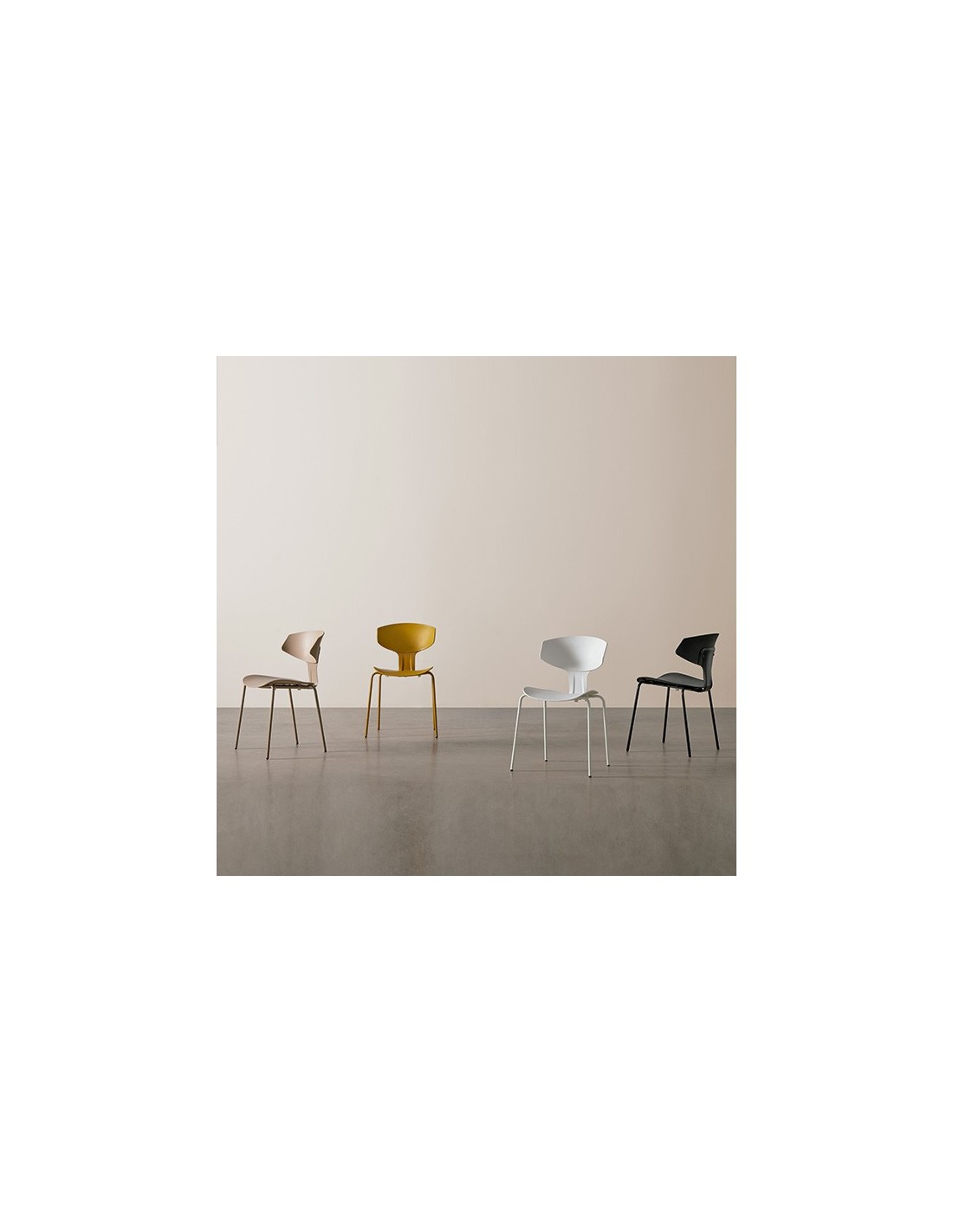As pernas de metal são ligeiramente inclinadas para fora para melhorar o equilíbrio e possuem protetores de piso para evitar arranhões. O design da cadeira RENE, com as suas linhas limpas e perfil elegante, torna-a ideal para uma variedade de ambientes, desde salas de jantar e escritórios até salas de espera ou estúdios criativos. Sua versatilidade o torna uma peça atraente para diversos estilos de decoração, do moderno e minimalista ao industrial e eclético.