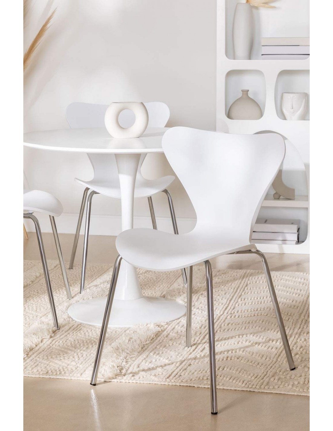 O caráter minimalista da cadeira a torna uma peça versátil que se adapta a qualquer estilo de decoração e pode ser colocada tanto em salas de jantar quanto em cozinhas. Além disso, por ser empilhável, economiza espaço quando não está em uso.